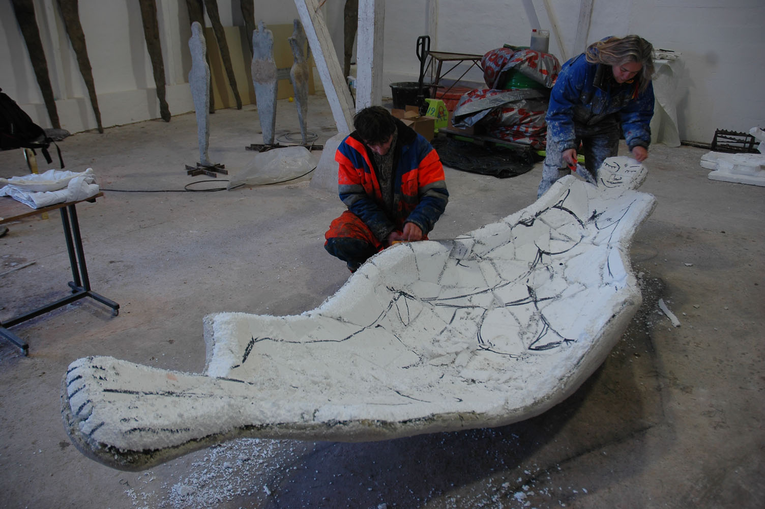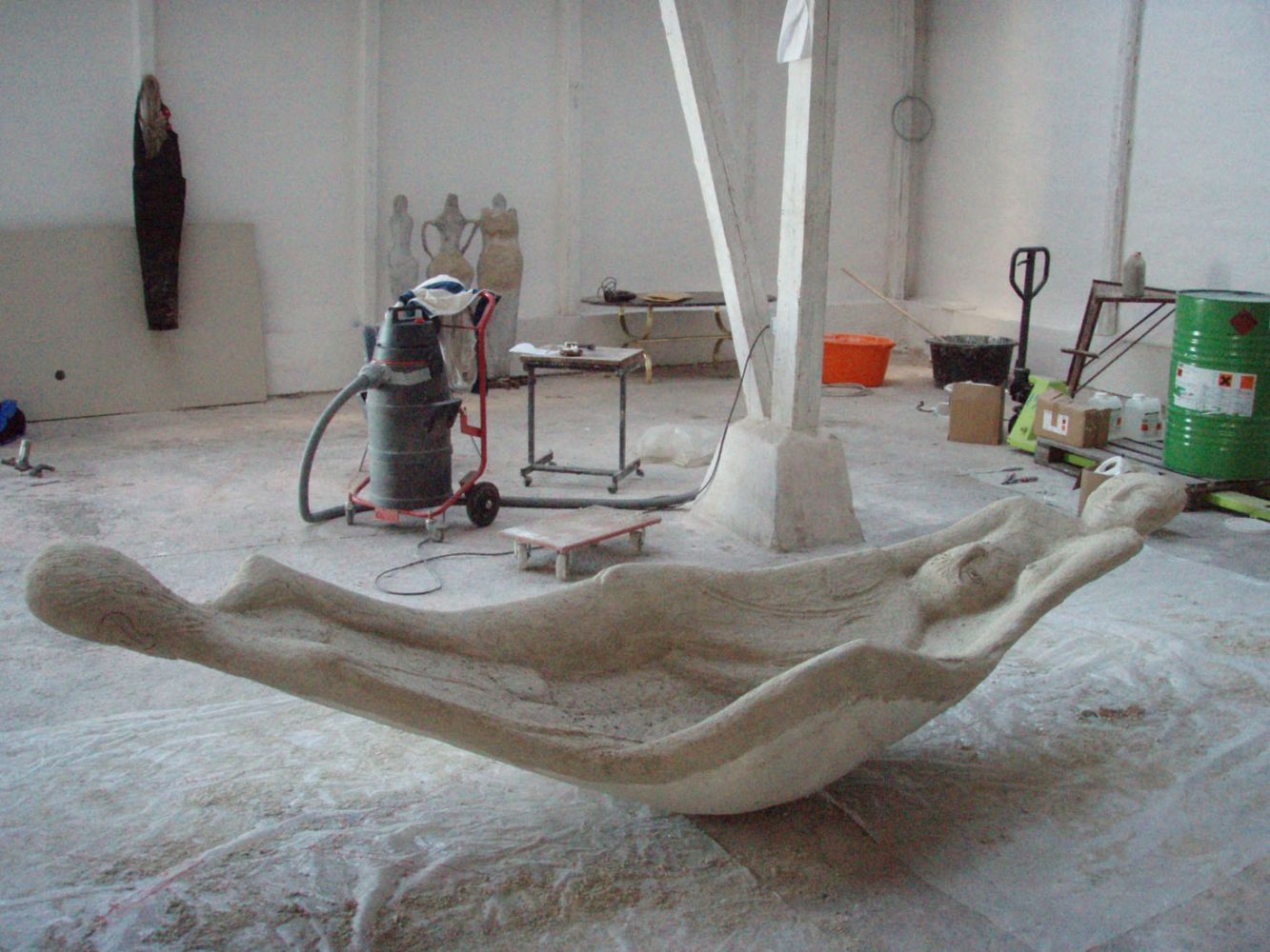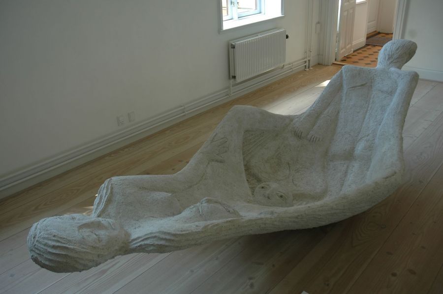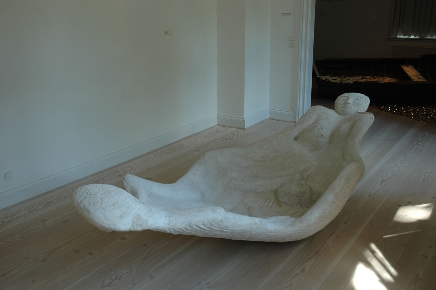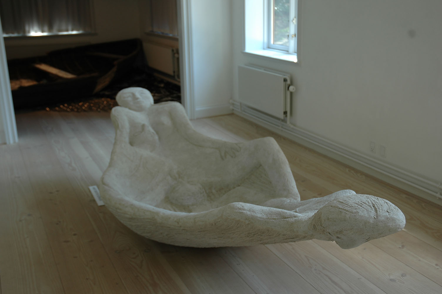 "Female Boat" is made out of cement. A woman who opens her loins, with men who are born or try to force their way in. She enjoys, provides or is used/abused. She is both safe as well as dangerous. The woman is a boat with her "passengers". The interpretation is intended to be very open. But could, for example, refer to women who come here dreaming of a new life and for various reasons end up in prostitution. With the sounds of an Arabic reading from the next room, one could also get associations of the debate about the position of women in many Muslim countries. But also the many abuses that take place in our own world - on many levels. The strong maternal figure and female power is also frightening and threatening in different ways in different cultures. On the ceiling above the sculpture there is a mirror.
