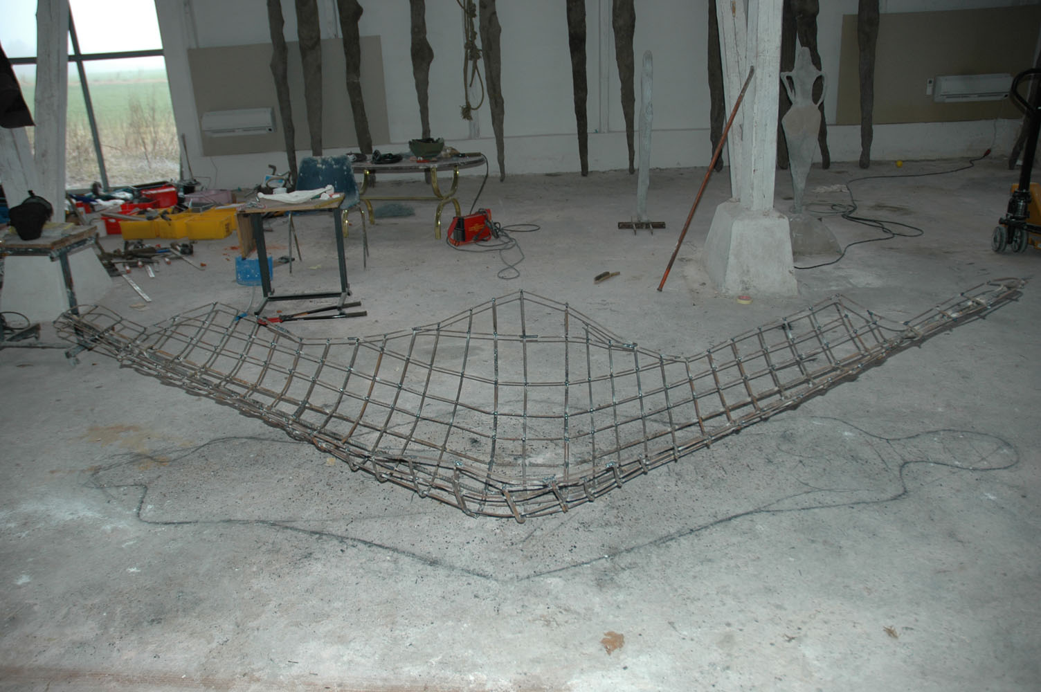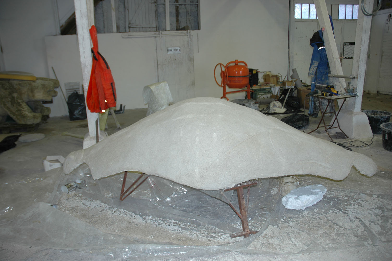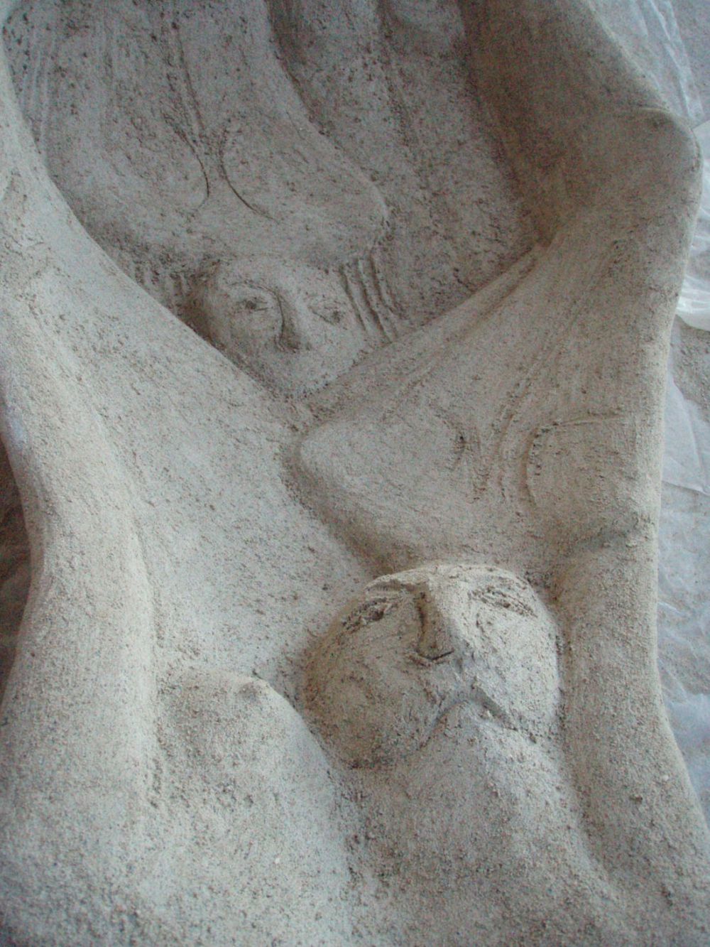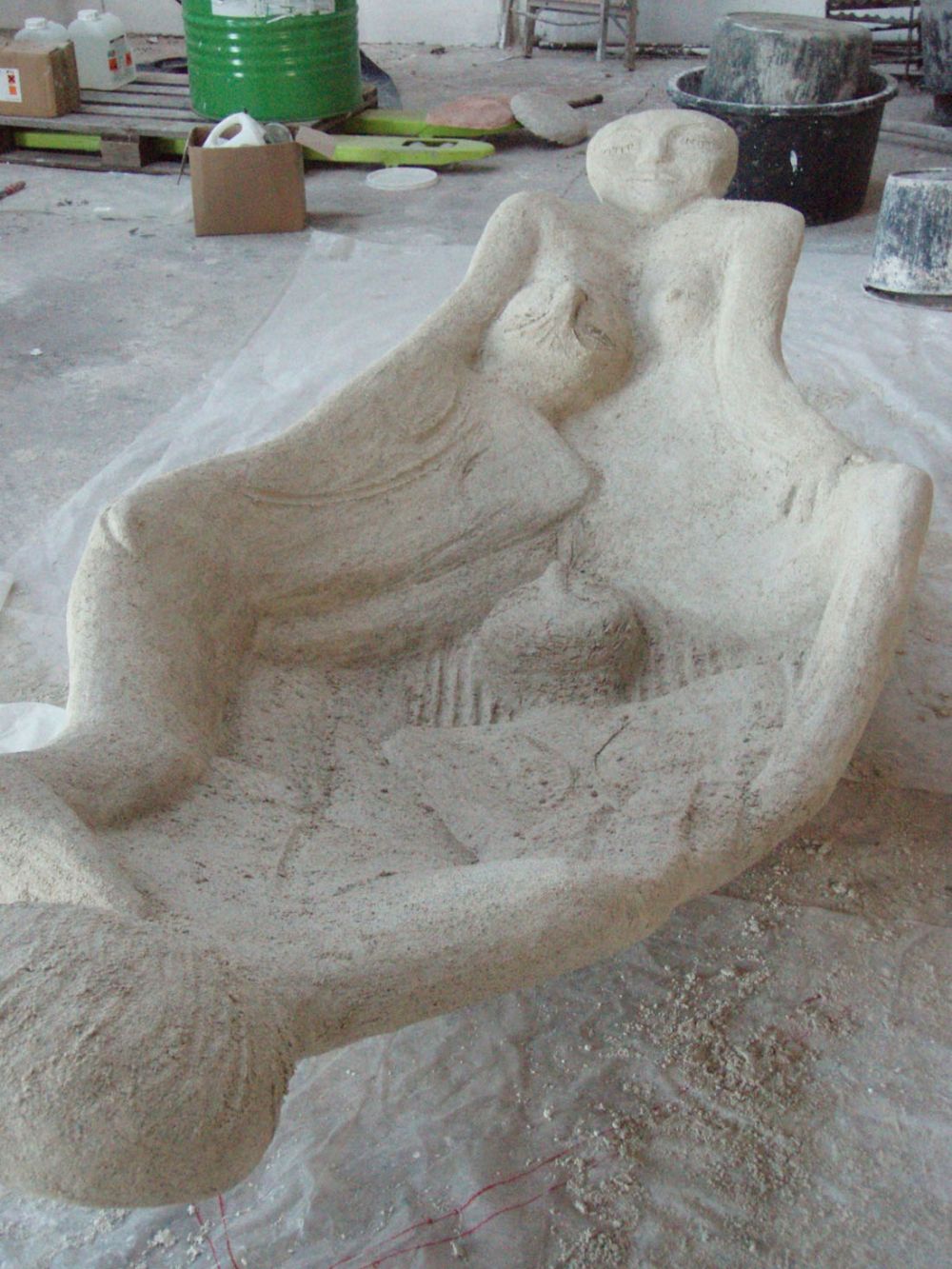 "Female Boat" is made out of cement. A woman who opens her loins, with men who are born or try to force their way in. She enjoys, provides or is used/abused. She is both safe as well as dangerous. The woman is a boat with her "passengers". The interpretation is intended to be very open. But could, for example, refer to women who come here dreaming of a new life and for various reasons end up in prostitution. With the sounds of an Arabic reading from the next room, one could also get associations of the debate about the position of women in many Muslim countries. But also the many abuses that take place in our own world - on many levels. The strong maternal figure and female power is also frightening and threatening in different ways in different cultures. On the ceiling above the sculpture there is a mirror.