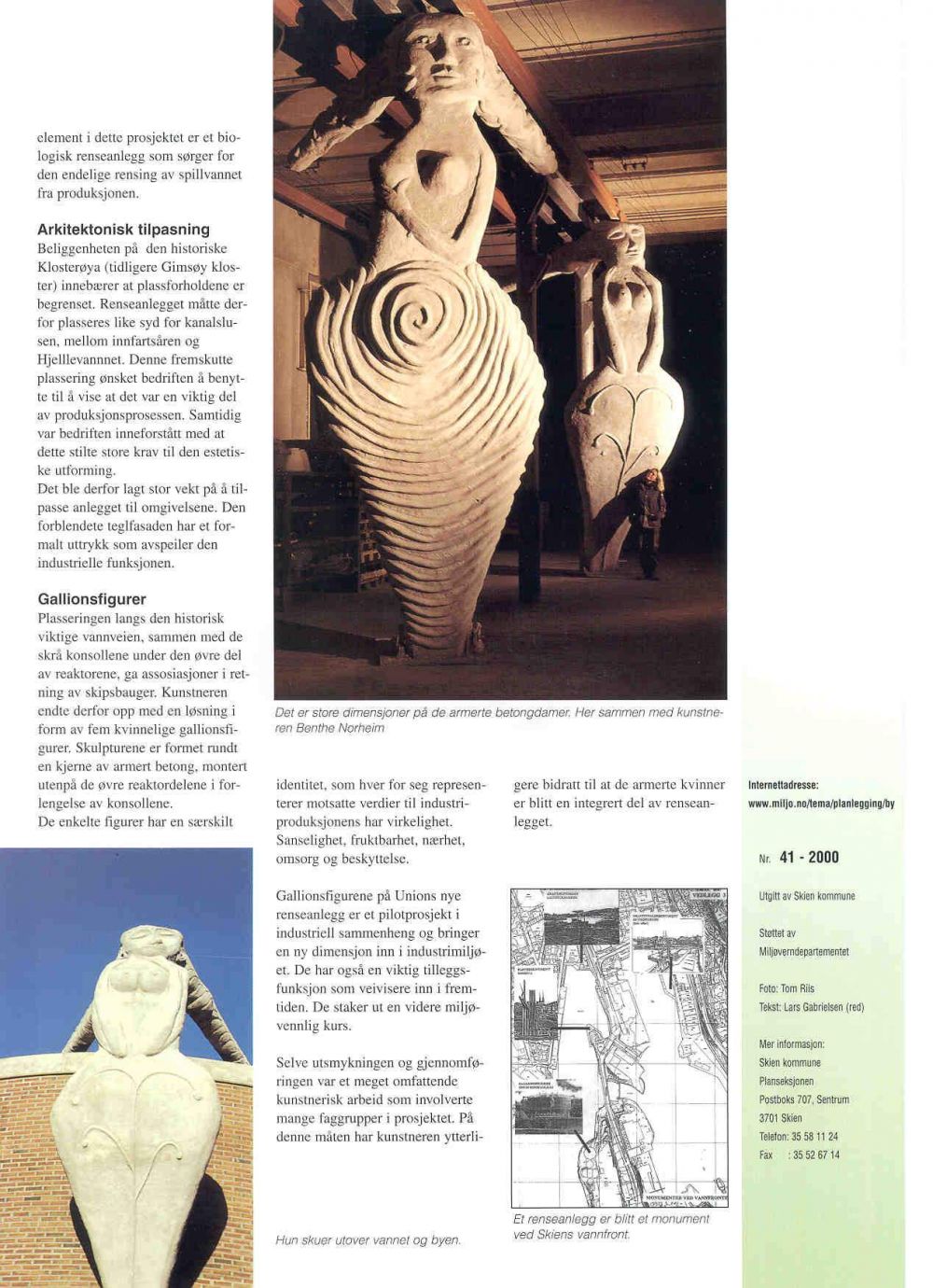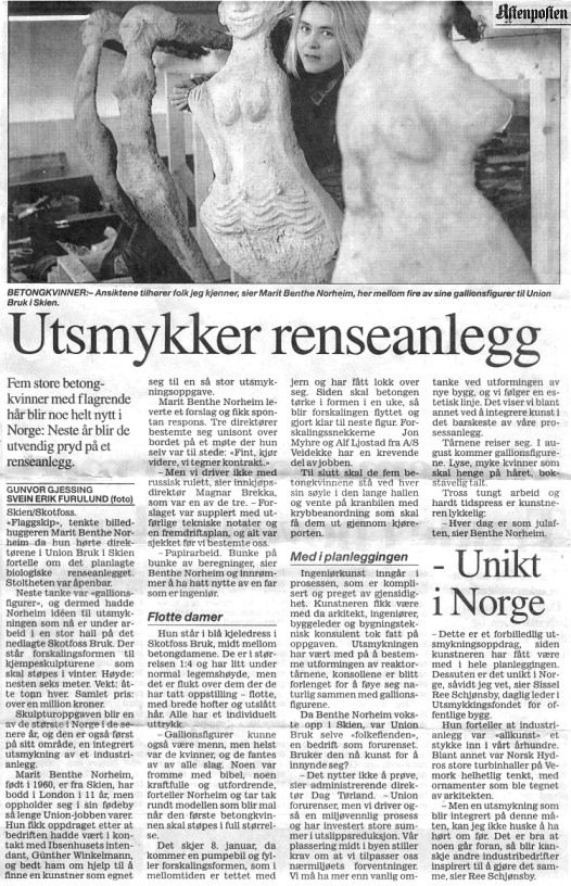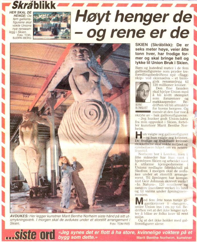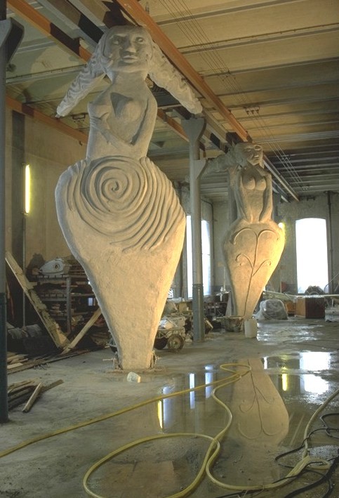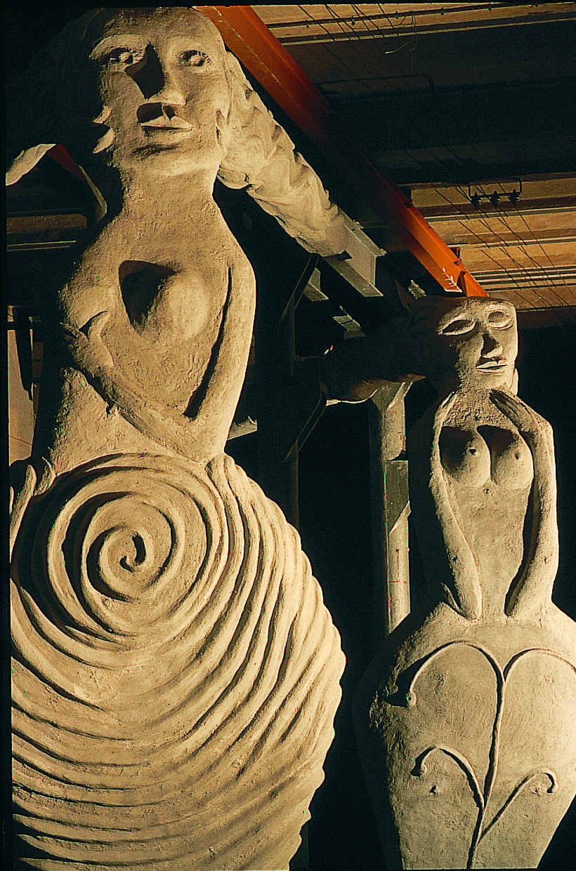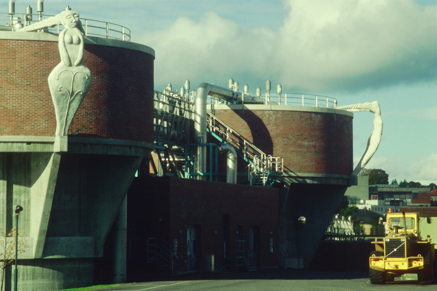 The sculptures are intended as an architectonic component of the two industrial purification tanks. The company wanted to create a positive focus for their (at that time) new biological purification tanks. This extension became the company’s flagship, both in terms of content as well as architectonically/visually because of the tanks of the building. I chose to use a fertility cycle consisting of female figureheads as an extension of the tanks, so that they became a part of the building. Just as the famous populist symbol of the figurehead has protected humankind on its voyages on unknown waters, so the cement women protect the biological, womb-like purification tanks. Each of the sculptures has its history associated with the process, as well as being intended as spiritual ”pin-ups” with content, in a very male-dominated factory environment, where the area around the commission was in use around the clock. In addition to the employees being very enthusiastic about their ladies, the company also got its own page on the Ministry of the Environment’s website for both visually and environmentally improving the environment in Skien. Norwegian design and industry magazines, both national and international, lined up to congratulate and praise us.