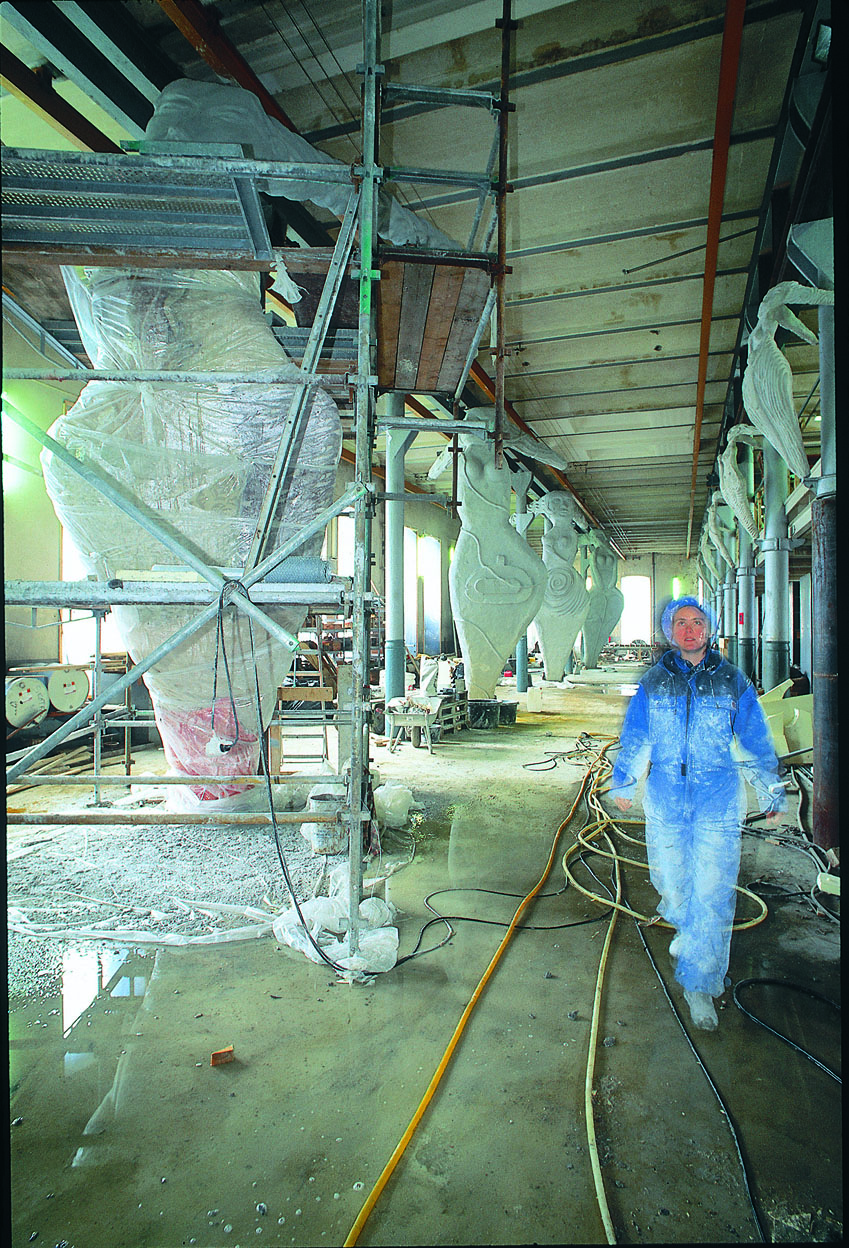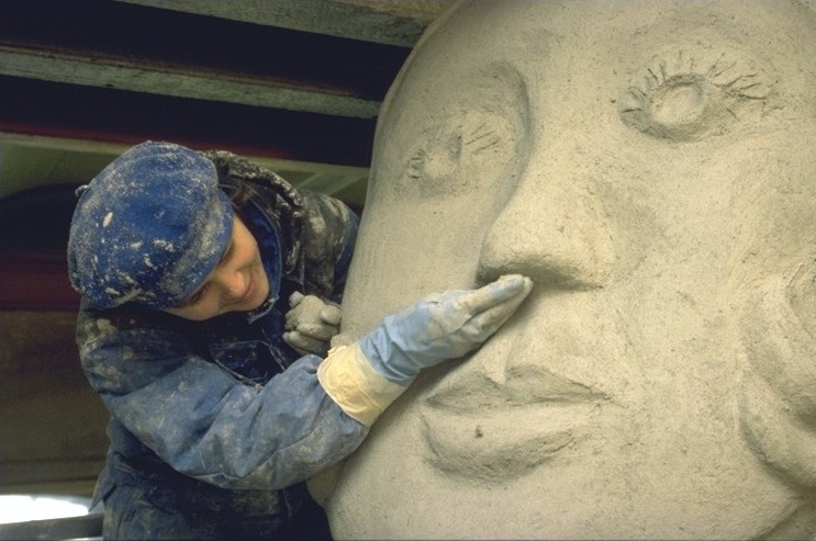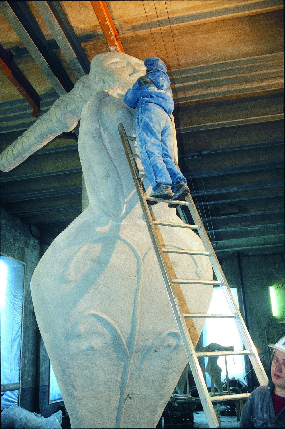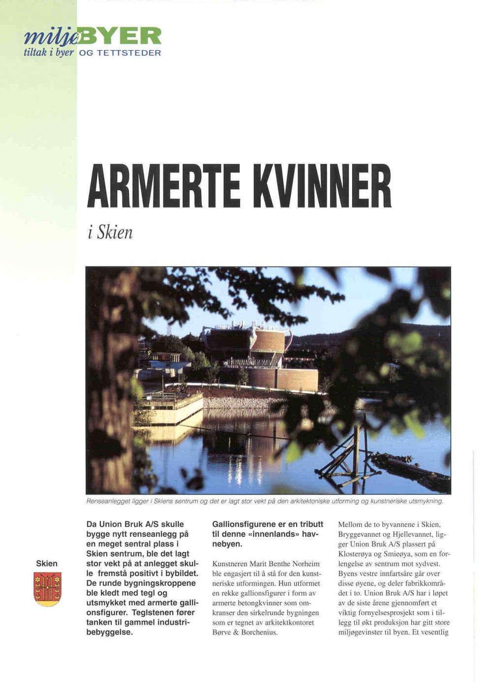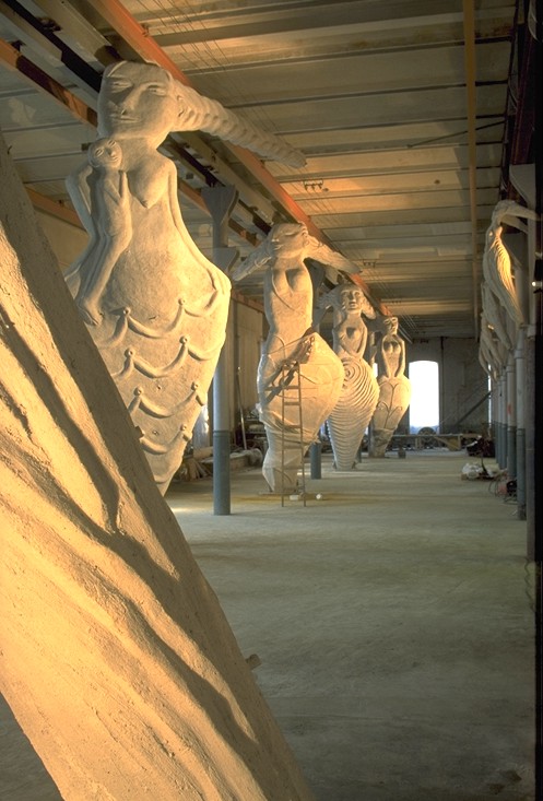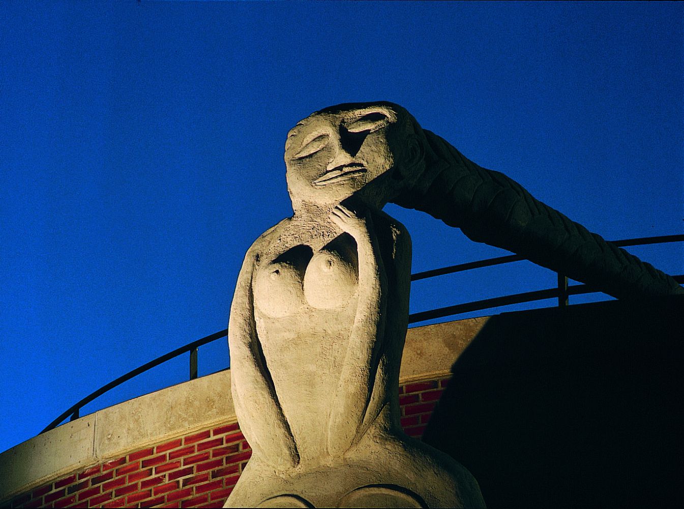 The sculptures are intended as an architectonic component of the two industrial purification tanks. The company wanted to create a positive focus for their (at that time) new biological purification tanks. This extension became the company’s flagship, both in terms of content as well as architectonically/visually because of the tanks of the building. I chose to use a fertility cycle consisting of female figureheads as an extension of the tanks, so that they became a part of the building. Just as the famous populist symbol of the figurehead has protected humankind on its voyages on unknown waters, so the cement women protect the biological, womb-like purification tanks. Each of the sculptures has its history associated with the process, as well as being intended as spiritual ”pin-ups” with content, in a very male-dominated factory environment, where the area around the commission was in use around the clock. In addition to the employees being very enthusiastic about their ladies, the company also got its own page on the Ministry of the Environment’s website for both visually and environmentally improving the environment in Skien. Norwegian design and industry magazines, both national and international, lined up to congratulate and praise us.