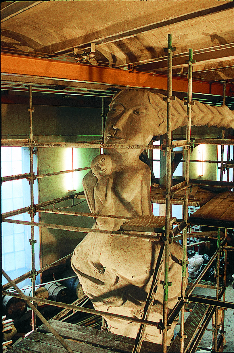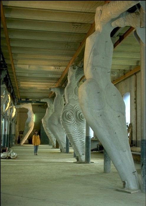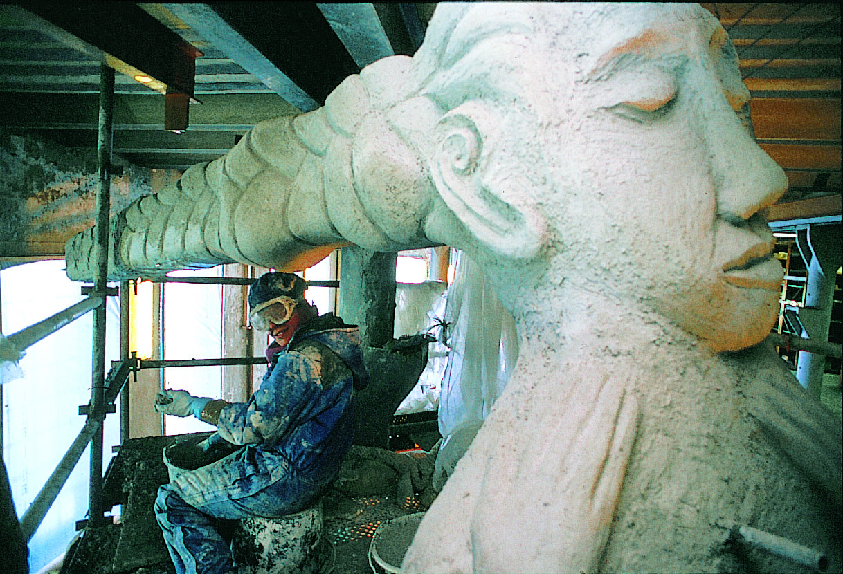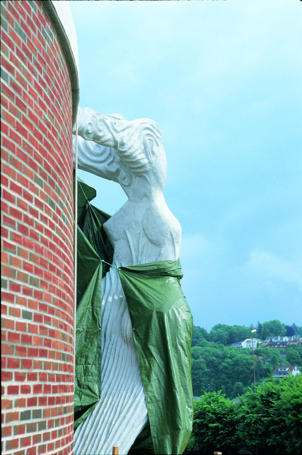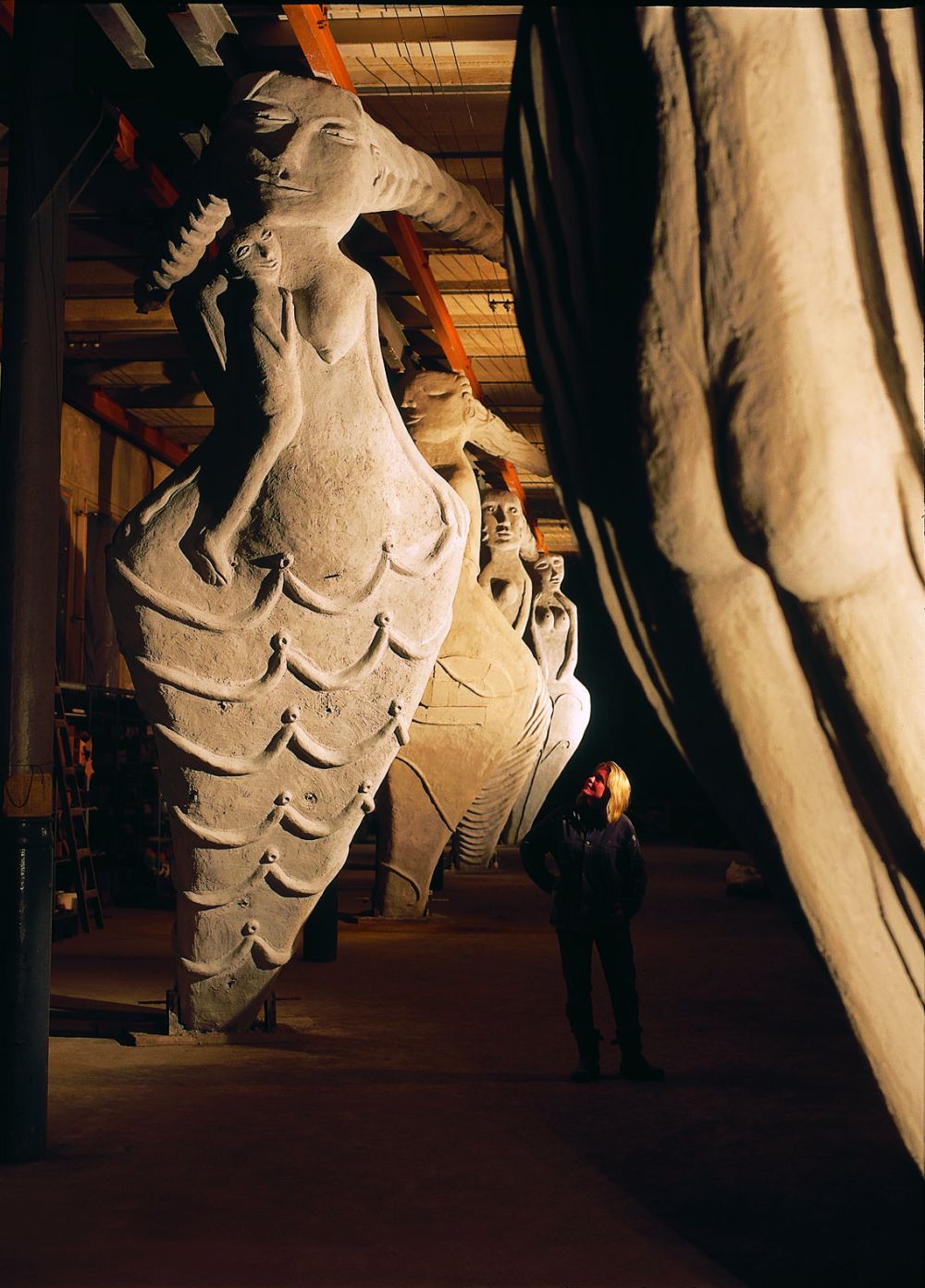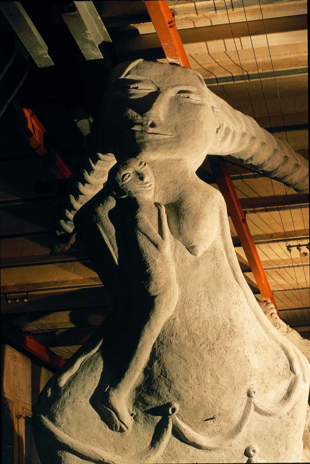 The sculptures are intended as an architectonic component of the two industrial purification tanks. The company wanted to create a positive focus for their (at that time) new biological purification tanks. This extension became the company’s flagship, both in terms of content as well as architectonically/visually because of the tanks of the building. I chose to use a fertility cycle consisting of female figureheads as an extension of the tanks, so that they became a part of the building. Just as the famous populist symbol of the figurehead has protected humankind on its voyages on unknown waters, so the cement women protect the biological, womb-like purification tanks. Each of the sculptures has its history associated with the process, as well as being intended as spiritual ”pin-ups” with content, in a very male-dominated factory environment, where the area around the commission was in use around the clock. In addition to the employees being very enthusiastic about their ladies, the company also got its own page on the Ministry of the Environment’s website for both visually and environmentally improving the environment in Skien. Norwegian design and industry magazines, both national and international, lined up to congratulate and praise us.