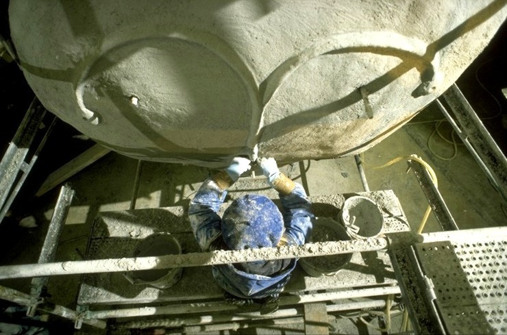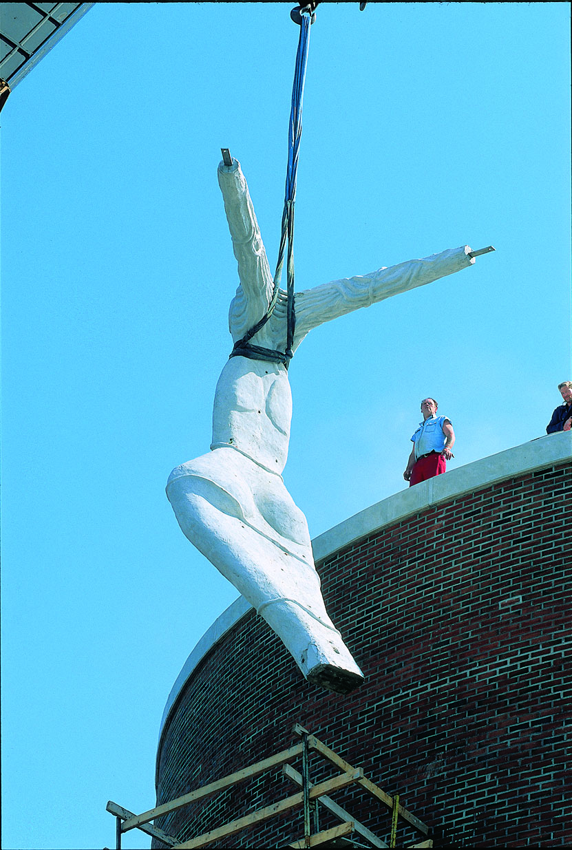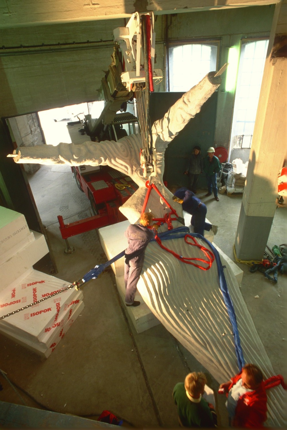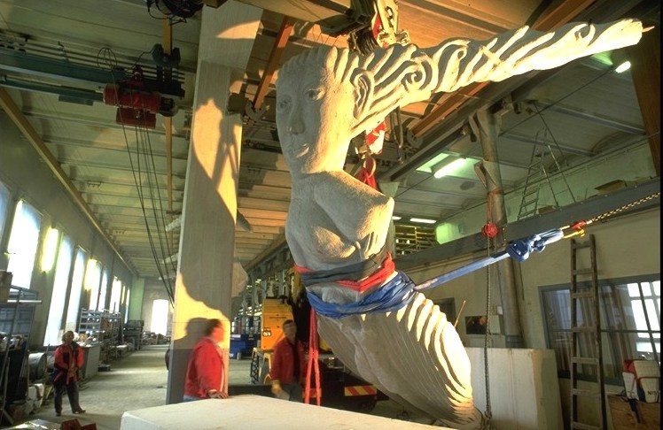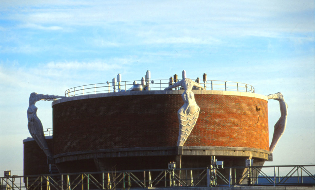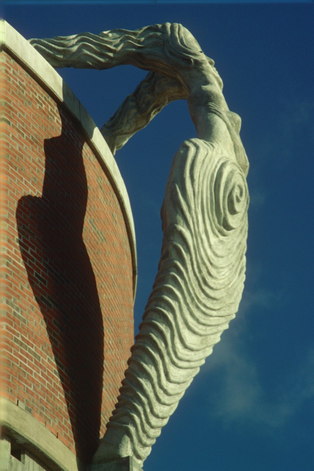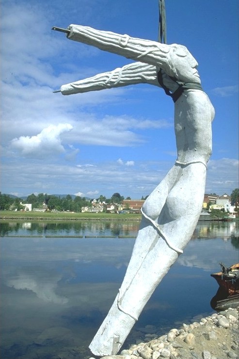 The sculptures are intended as an architectonic component of the two industrial purification tanks. The company wanted to create a positive focus for their (at that time) new biological purification tanks. This extension became the company’s flagship, both in terms of content as well as architectonically/visually because of the tanks of the building. I chose to use a fertility cycle consisting of female figureheads as an extension of the tanks, so that they became a part of the building. Just as the famous populist symbol of the figurehead has protected humankind on its voyages on unknown waters, so the cement women protect the biological, womb-like purification tanks. Each of the sculptures has its history associated with the process, as well as being intended as spiritual ”pin-ups” with content, in a very male-dominated factory environment, where the area around the commission was in use around the clock. In addition to the employees being very enthusiastic about their ladies, the company also got its own page on the Ministry of the Environment’s website for both visually and environmentally improving the environment in Skien. Norwegian design and industry magazines, both national and international, lined up to congratulate and praise us.