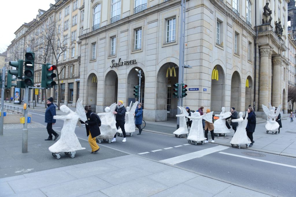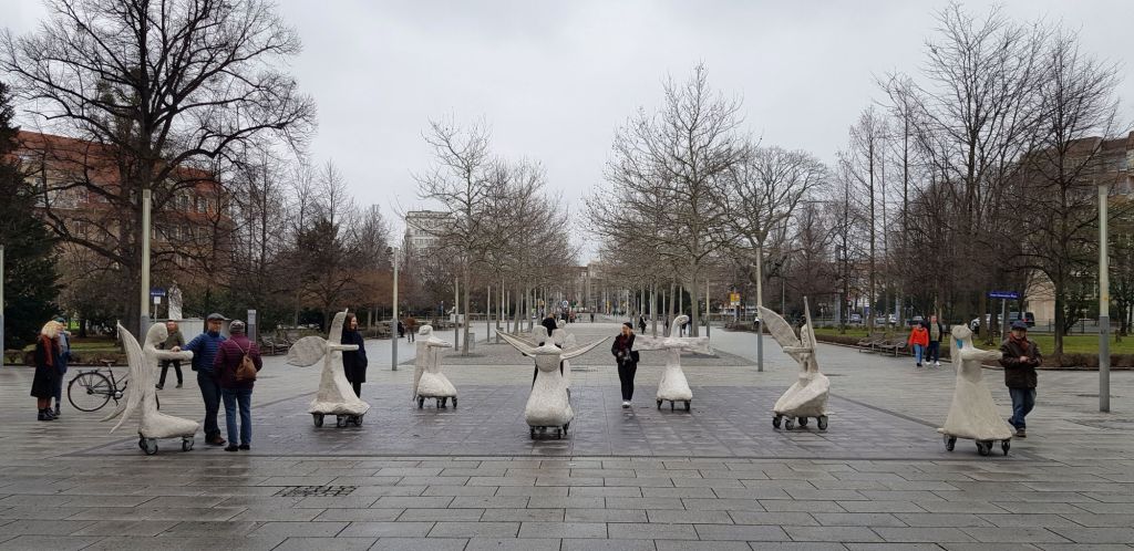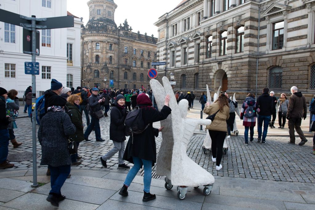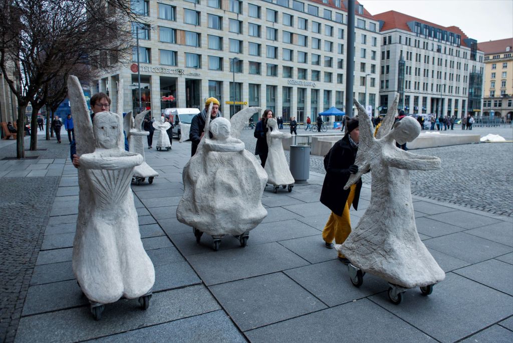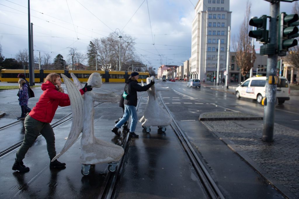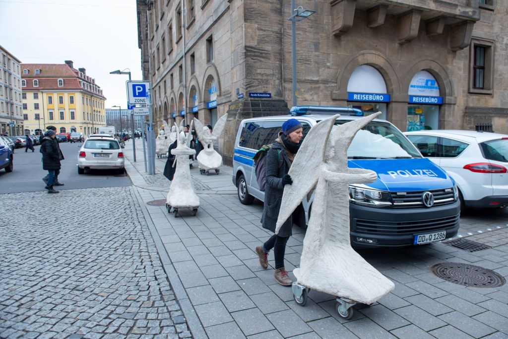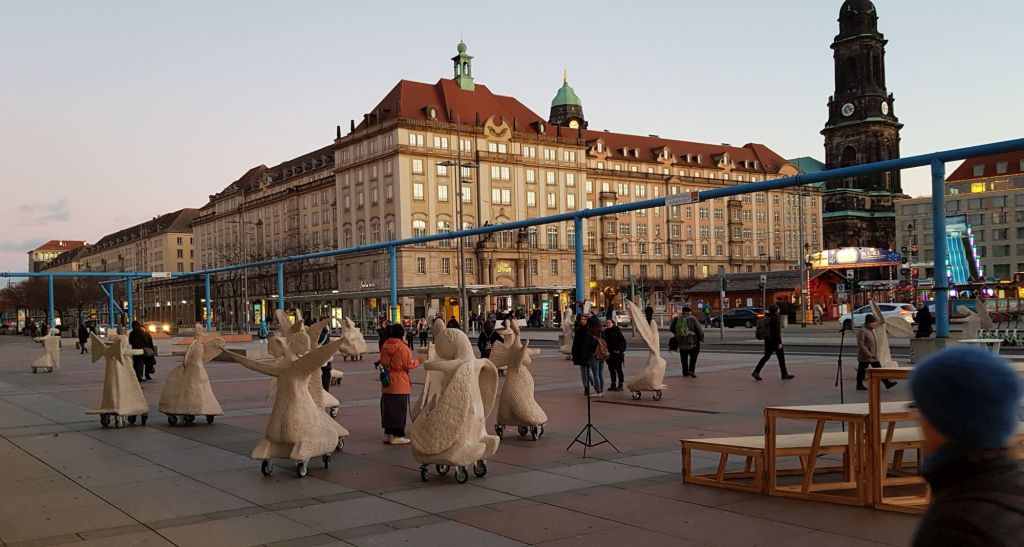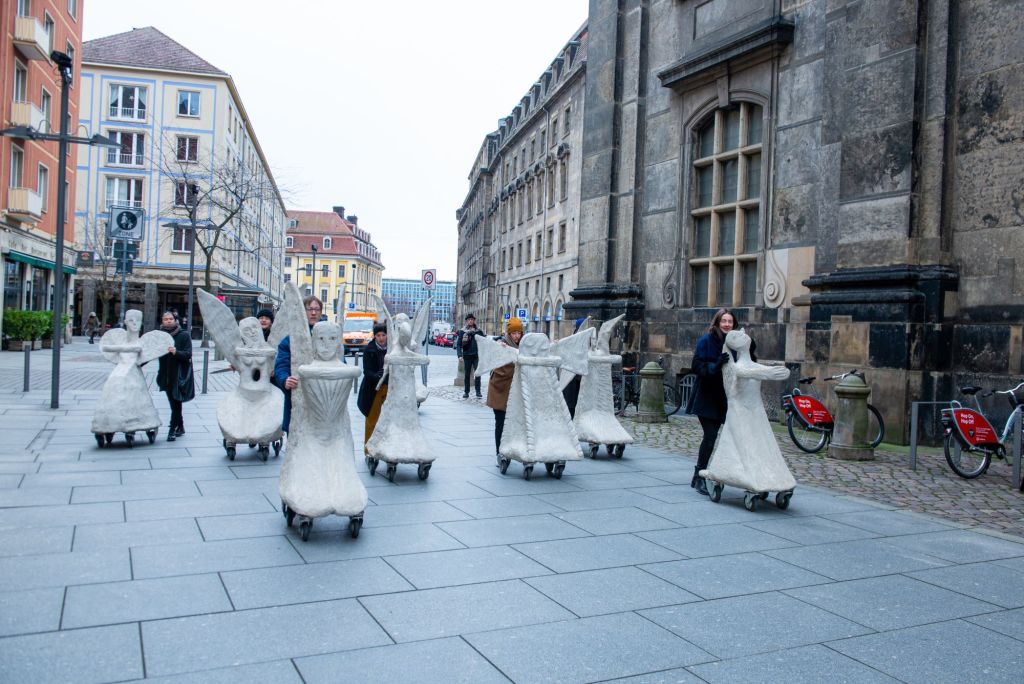 The flock of 17 Rolling angels where released into the public space in the center of Dresden in front of the Culture Palace on the 5th of February, in the presence of the mayor of Dresden, Dirk Hilbert. Then they moved around Dresden until the Memorial on February 13, set in the program as a Performance of 17 angels. A day when thousands of people held hands in a ring around the city to show that they are united for peace. The Angel Flock continues its journey in Dresden, until May 8, 2020, the day of capitulation. They want to use Rolling Angels as messengers of hope, comfort and peace.