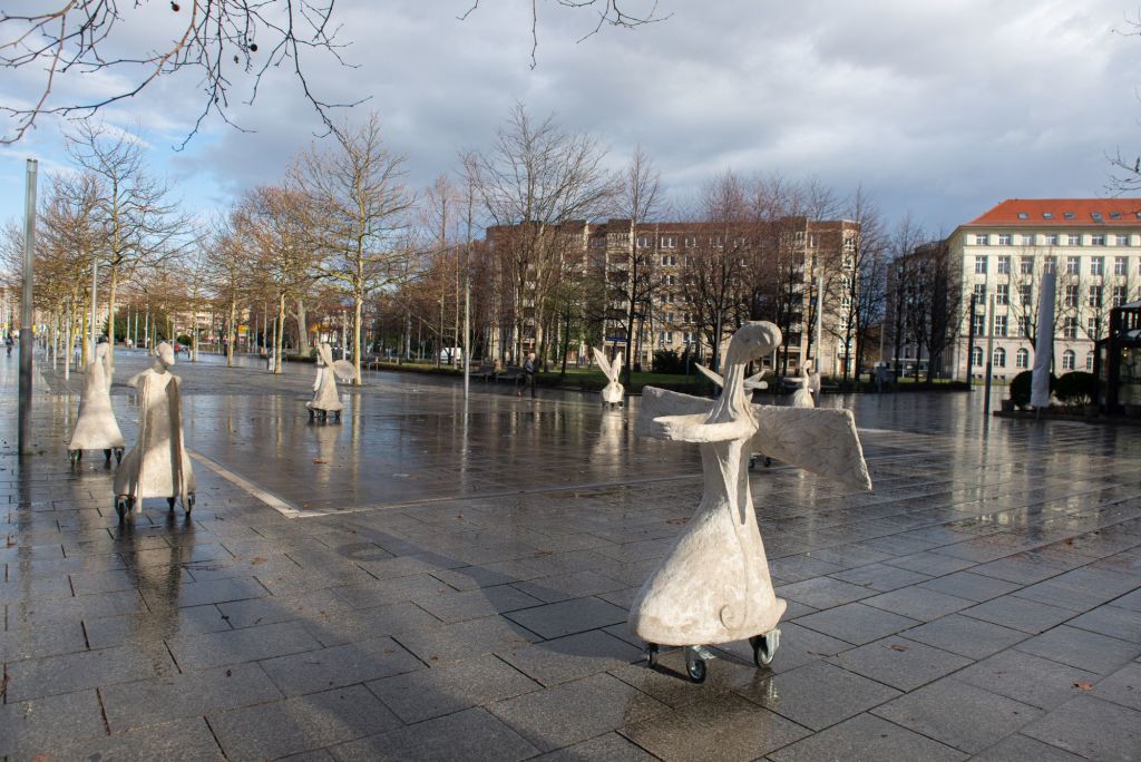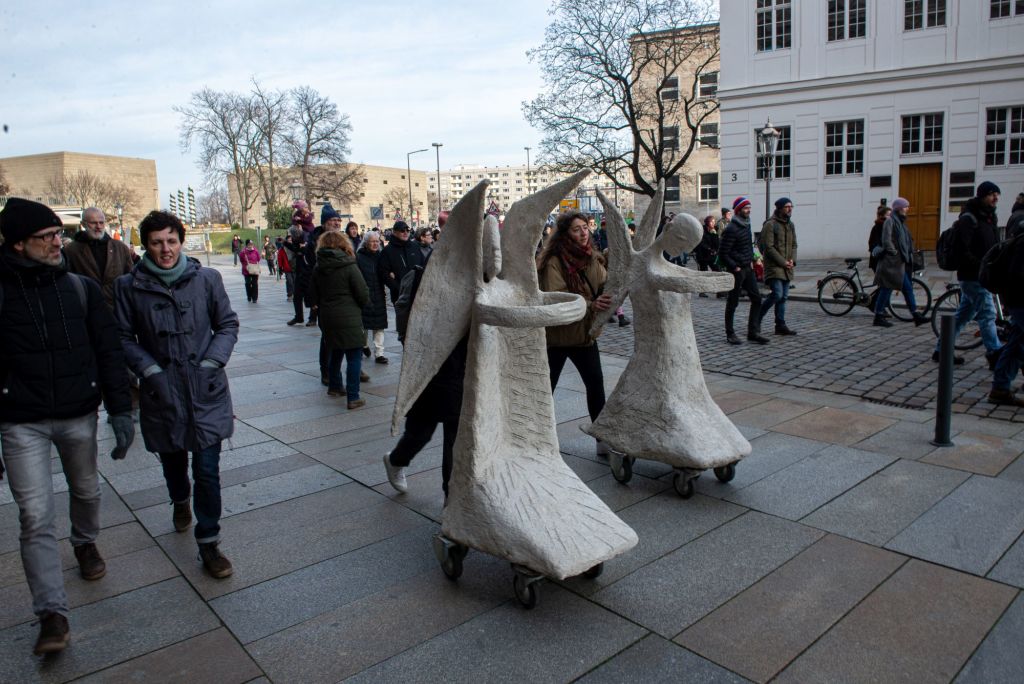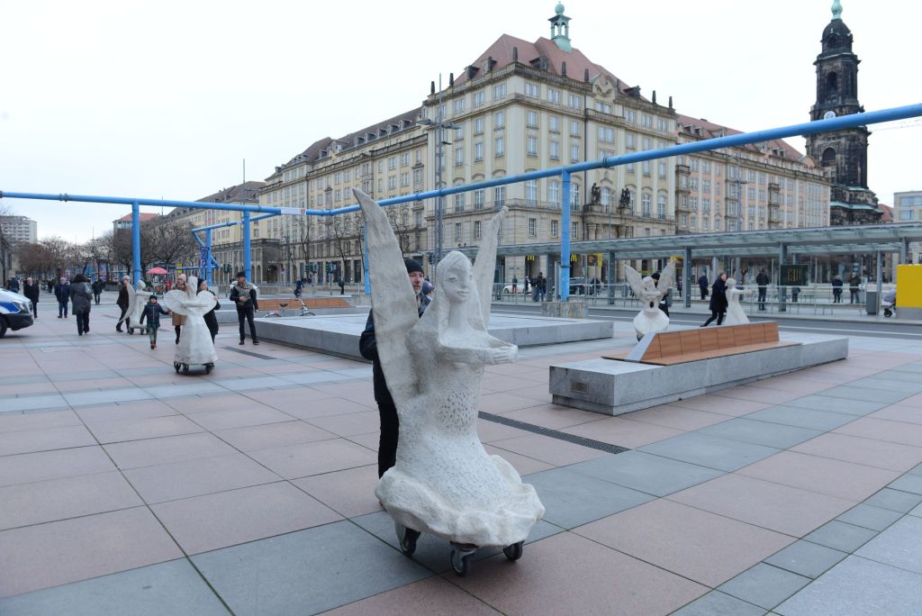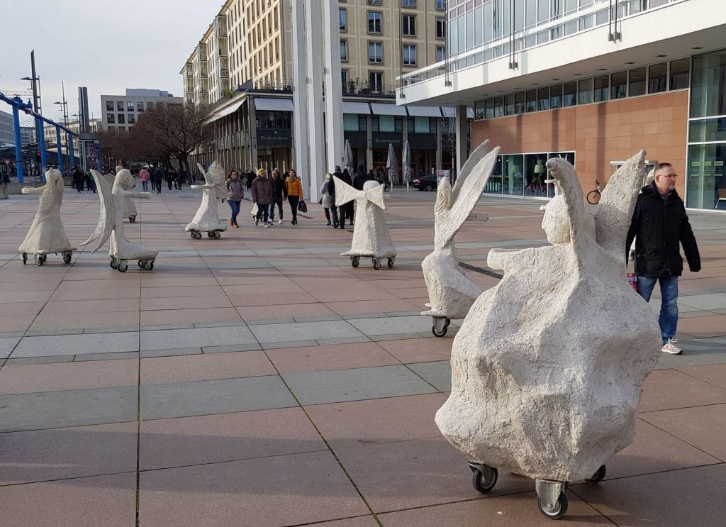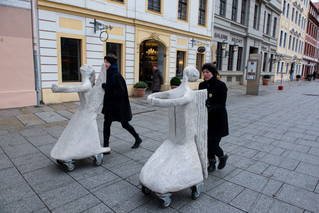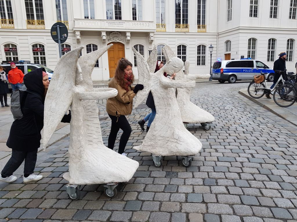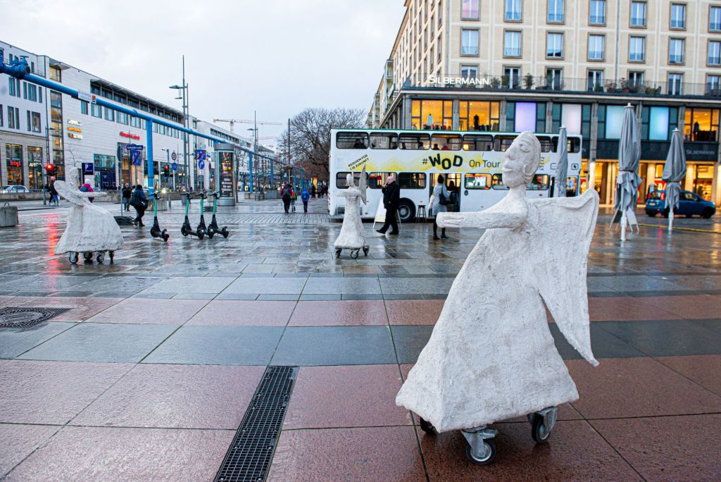 The flock of 17 Rolling angels where released into the public space in the center of Dresden in front of the Culture Palace on the 5th of February, in the presence of the mayor of Dresden, Dirk Hilbert. Then they moved around Dresden until the Memorial on February 13, set in the program as a Performance of 17 angels. A day when thousands of people held hands in a ring around the city to show that they are united for peace. The Angel Flock continues its journey in Dresden, until May 8, 2020, the day of capitulation. They want to use Rolling Angels as messengers of hope, comfort and peace.