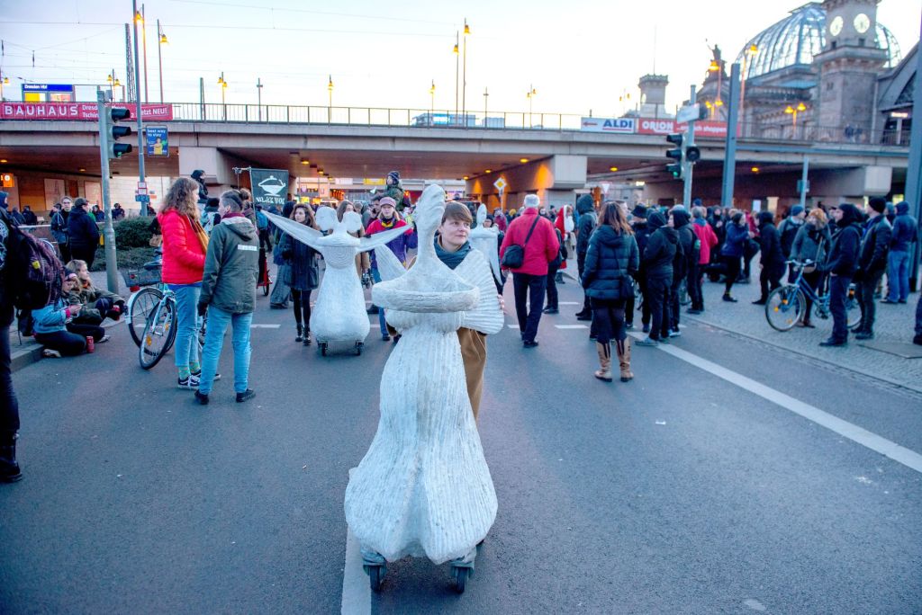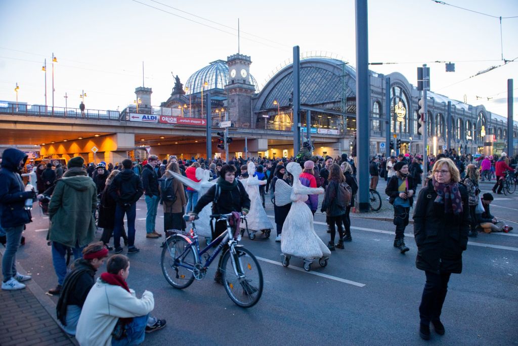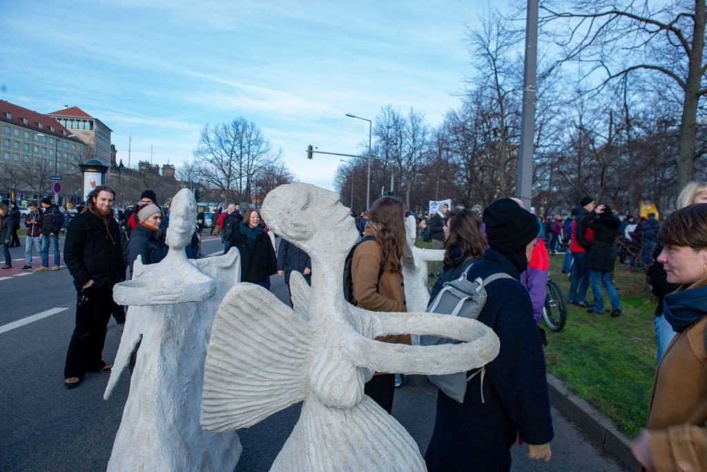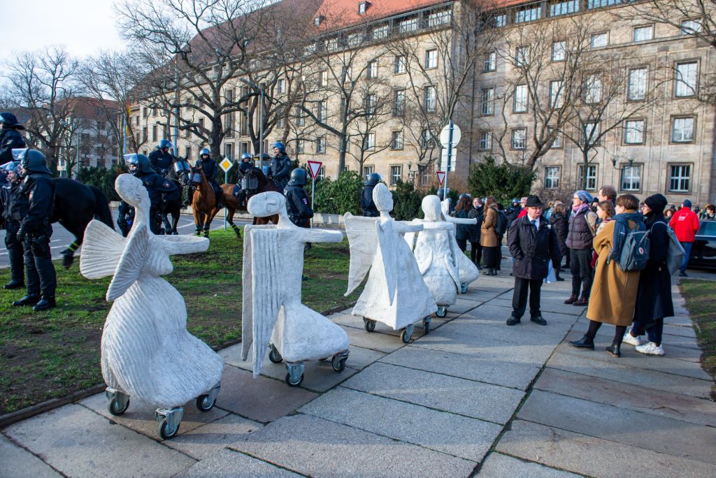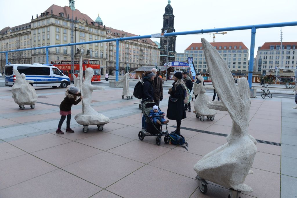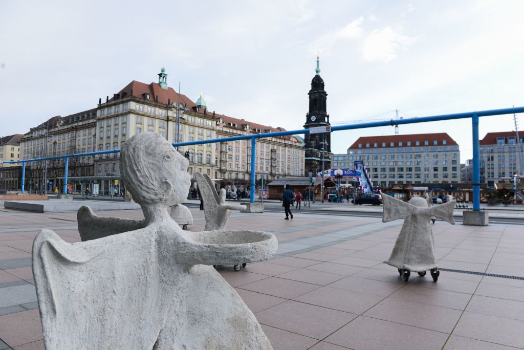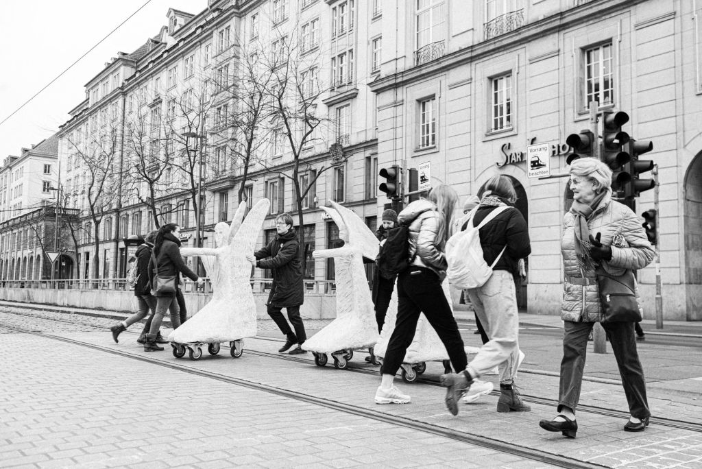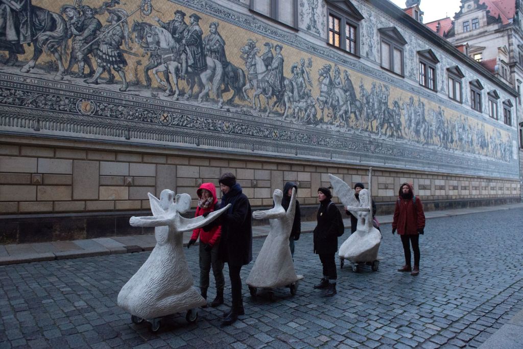 The flock of 17 Rolling angels where released into the public space in the center of Dresden in front of the Culture Palace on the 5th of February, in the presence of the mayor of Dresden, Dirk Hilbert. Then they moved around Dresden until the Memorial on February 13, set in the program as a Performance of 17 angels. A day when thousands of people held hands in a ring around the city to show that they are united for peace. The Angel Flock continues its journey in Dresden, until May 8, 2020, the day of capitulation. They want to use Rolling Angels as messengers of hope, comfort and peace.