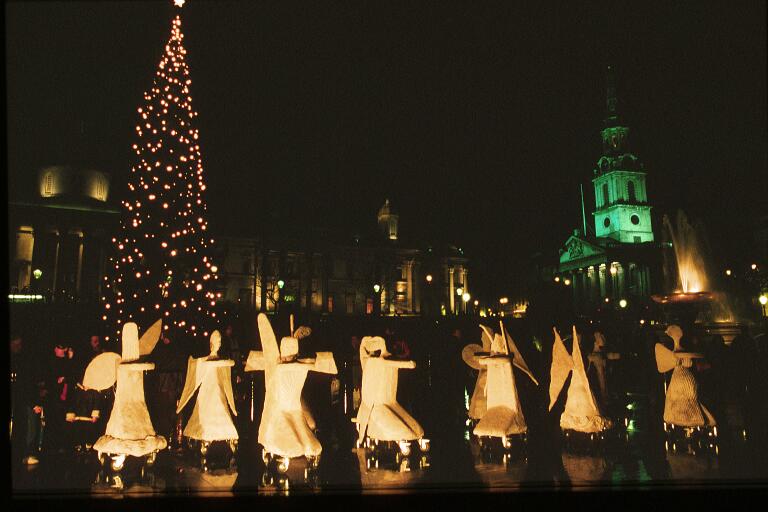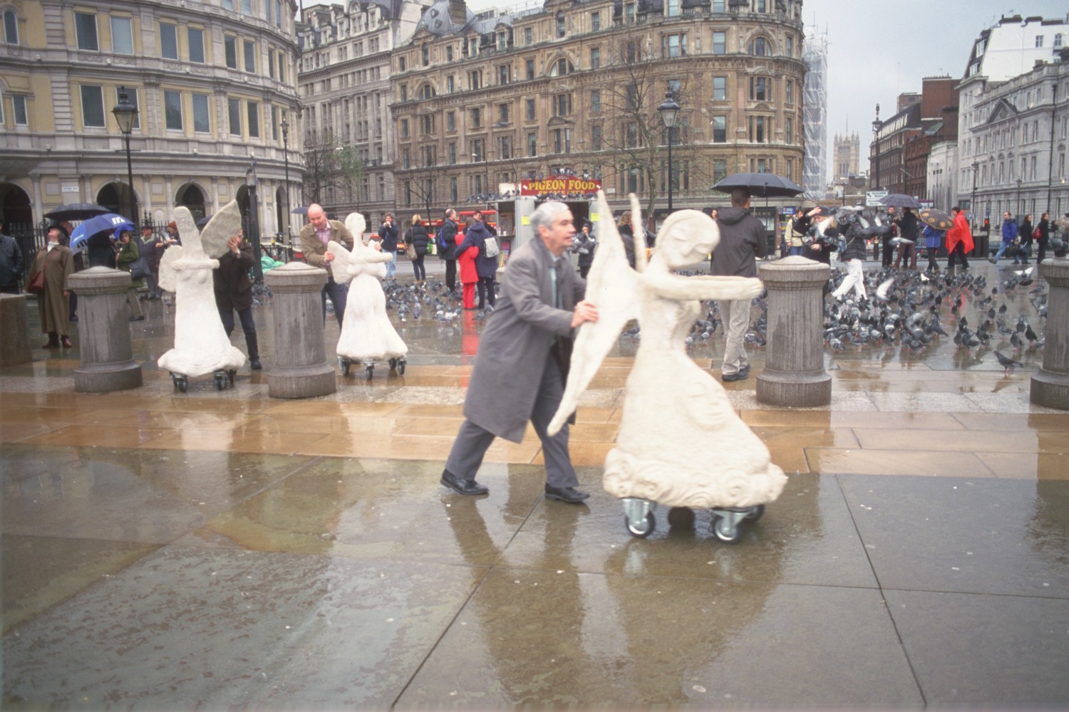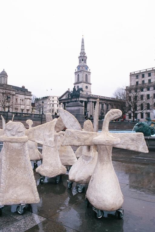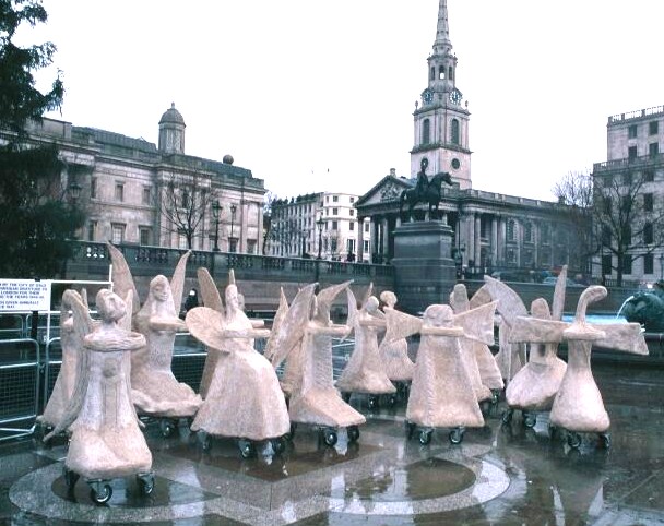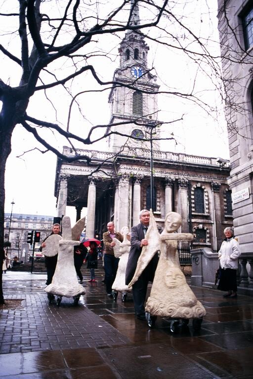 These angels have rolled through the centre of Oslo, for the opening of the Jakob Kultur church, after which they rolled through Wick in Northern Scotland, then on to London, English National Opera and a stay at Trafalgar square between Christmas and New Year. Afterwards, they visited the Church of St. Martin in the Fields and Salisbury Cathedral concluding with a roll around Sæby in Denmark. Over the course of the whole journey the Norwegian Solistkor and the soloist Siri Torjesen followed them, to perform the work ”Rolling Angels” by Geir Johnson, written specially for the work. They also had stays at galleries both in Norway, Denmark and London, as an installation where the stillness provided a possibility for reflection and the sounds were not mixed with sounds from the outside world.
