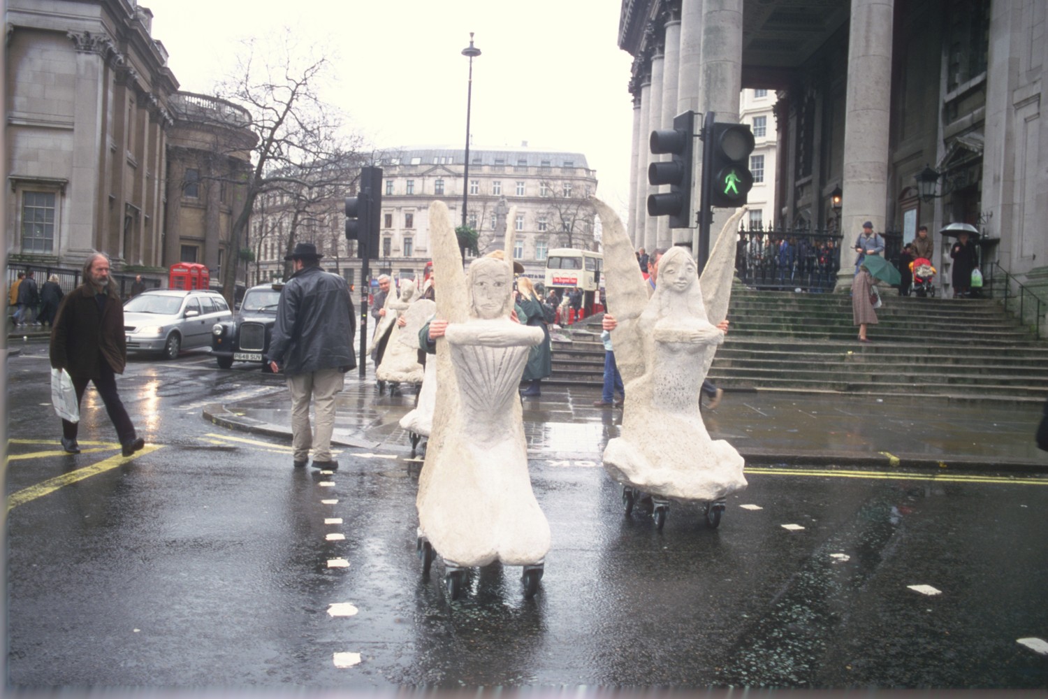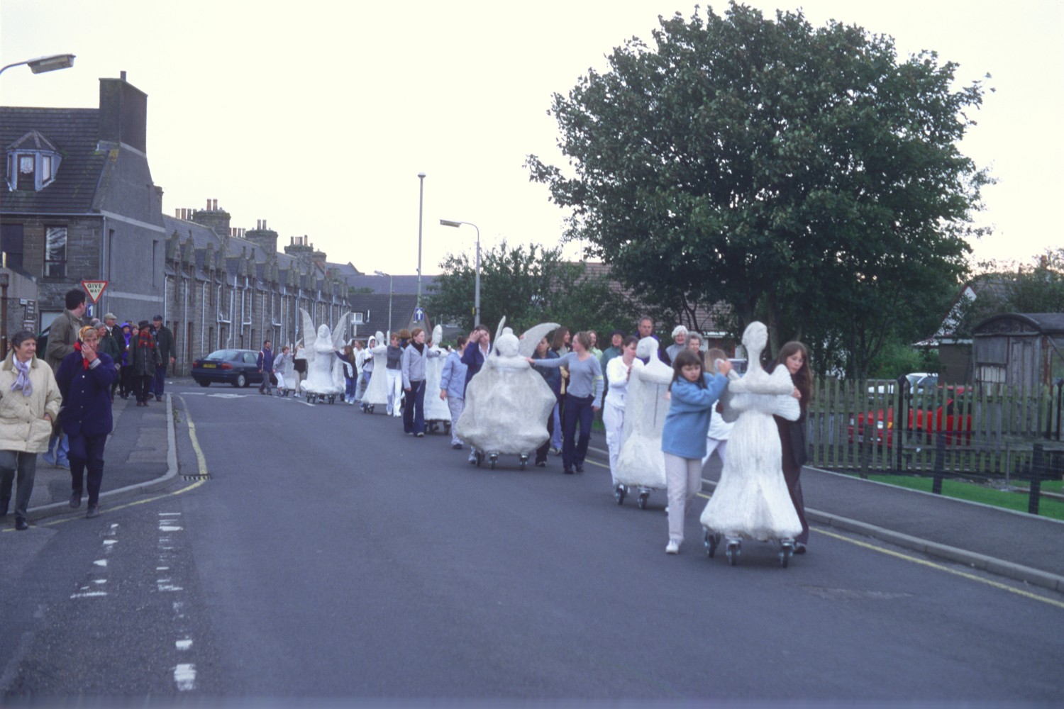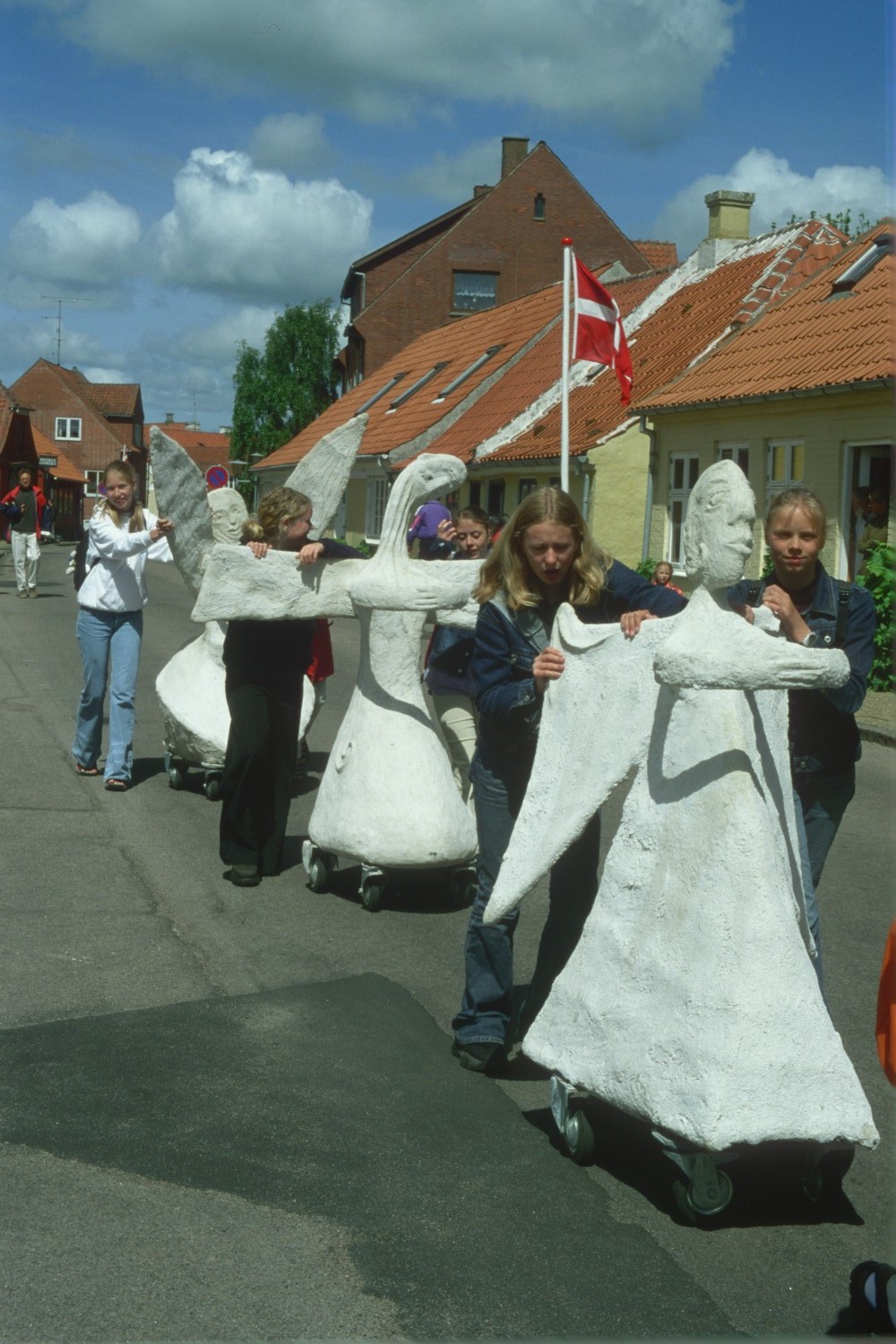 Angels are, just like the figureheads, populist symbols, which everyone has a relationship to at one level or another. It has been exciting and enlightening to make a work that is as adaptable as this one, where audience participation and involvement have been crucial for being able to use them in the public space. They have been pulled and pushed through the towns by both young and old.