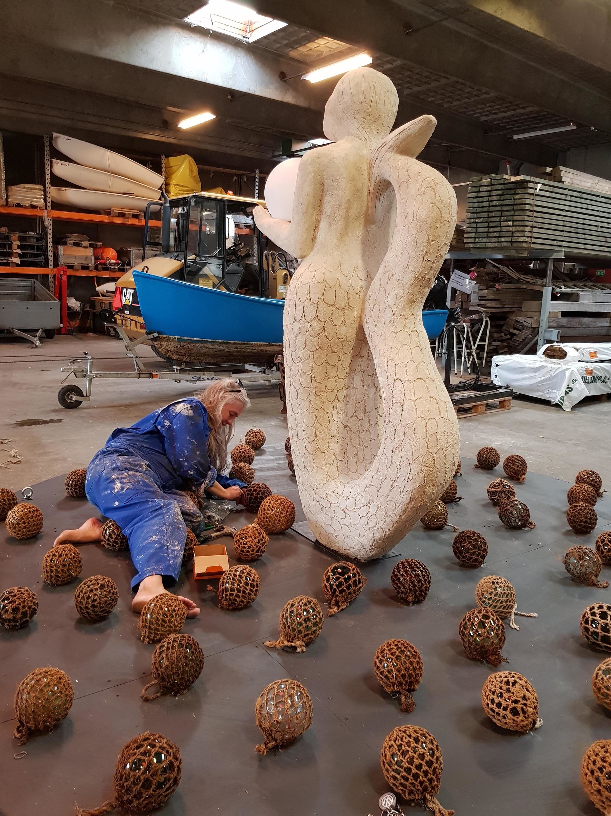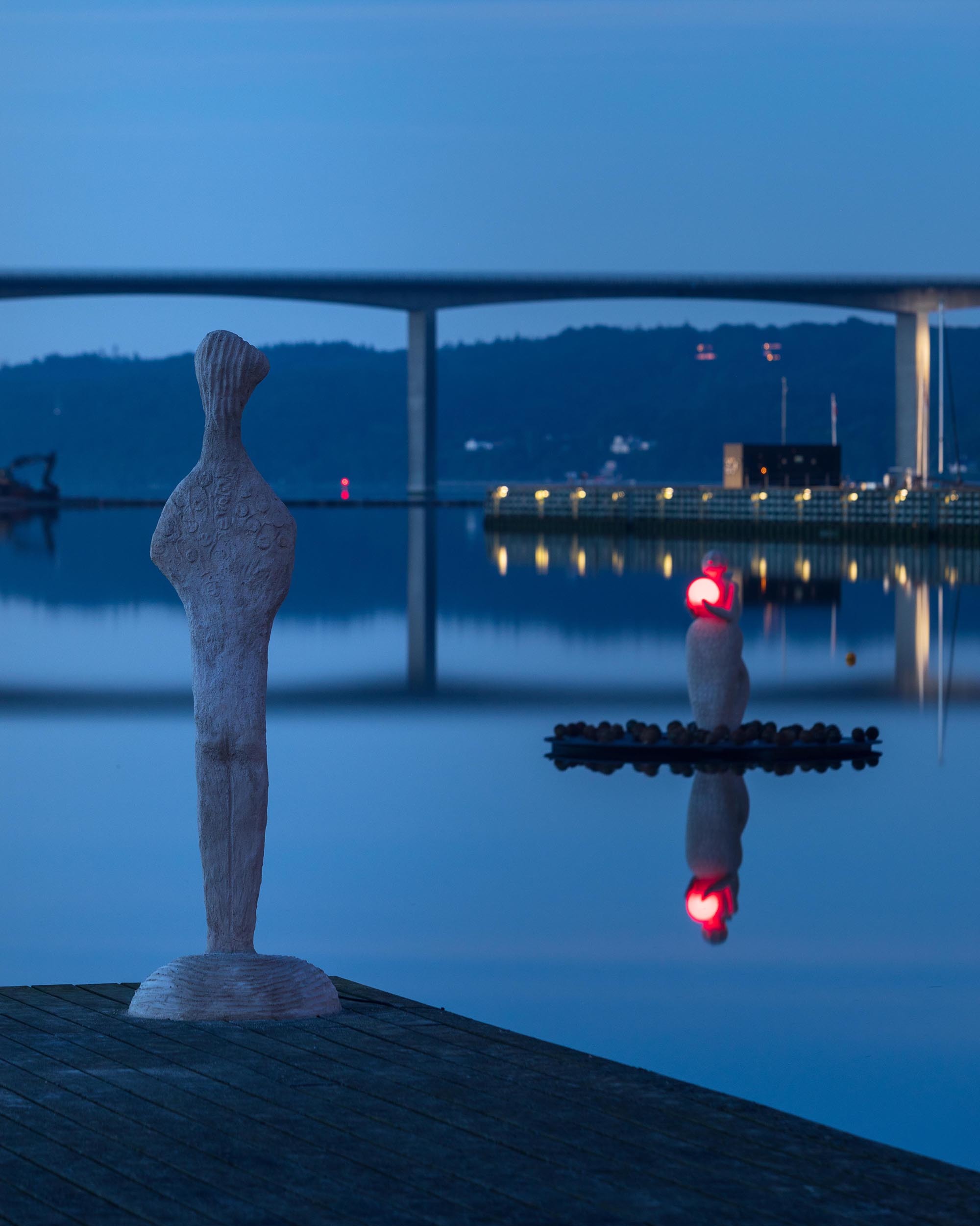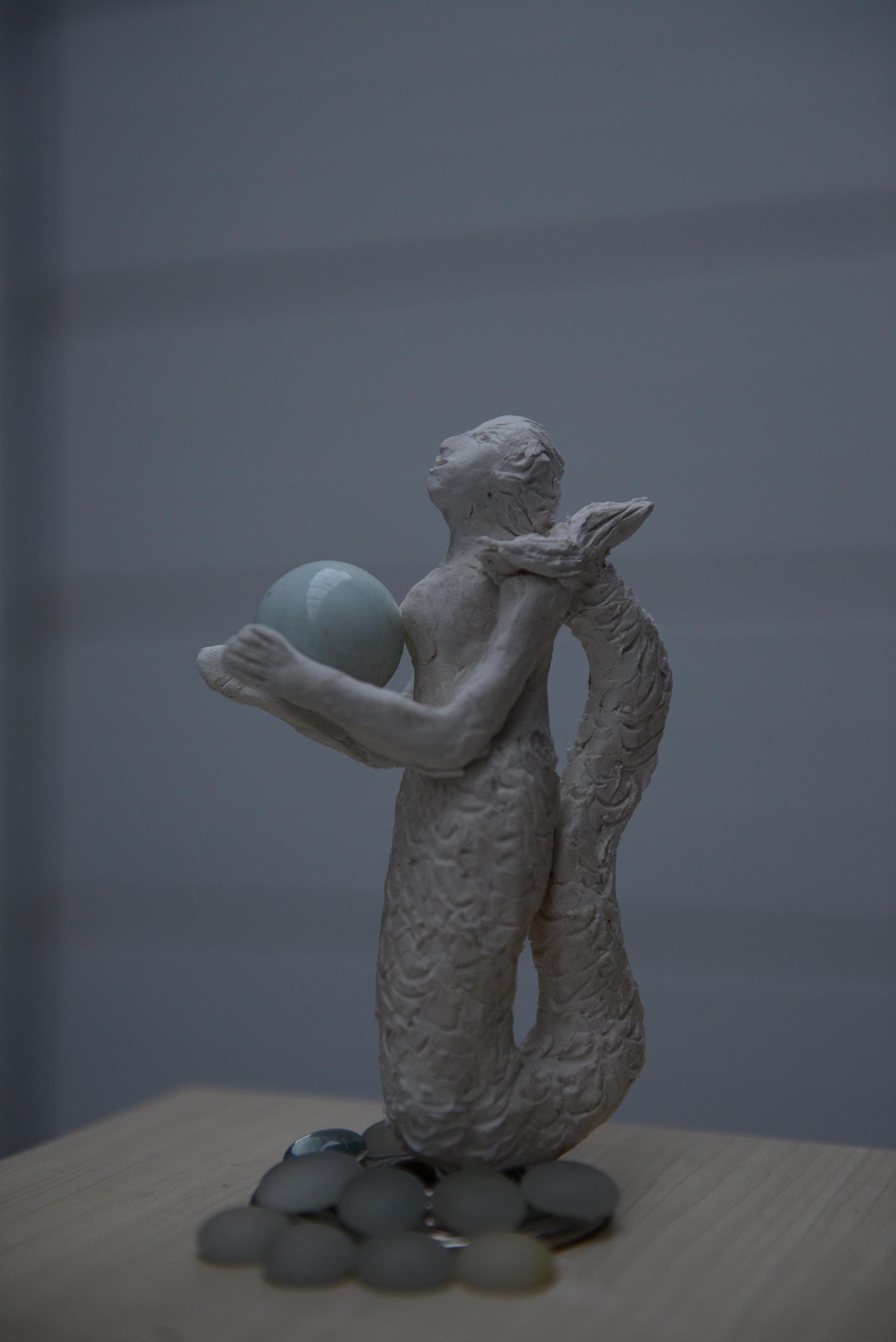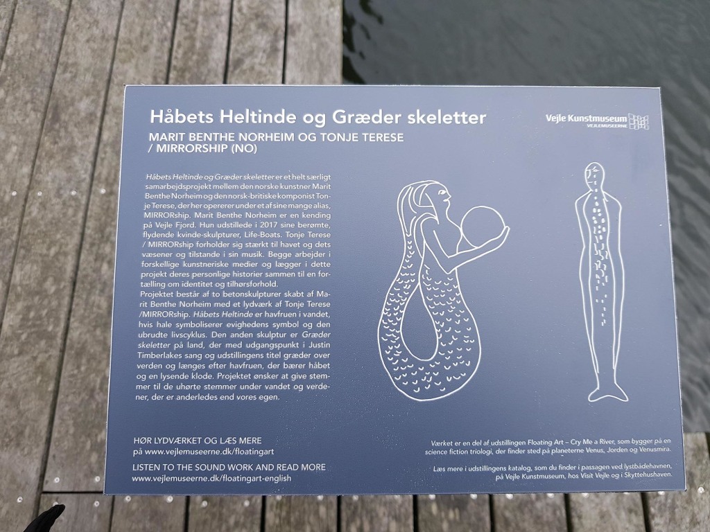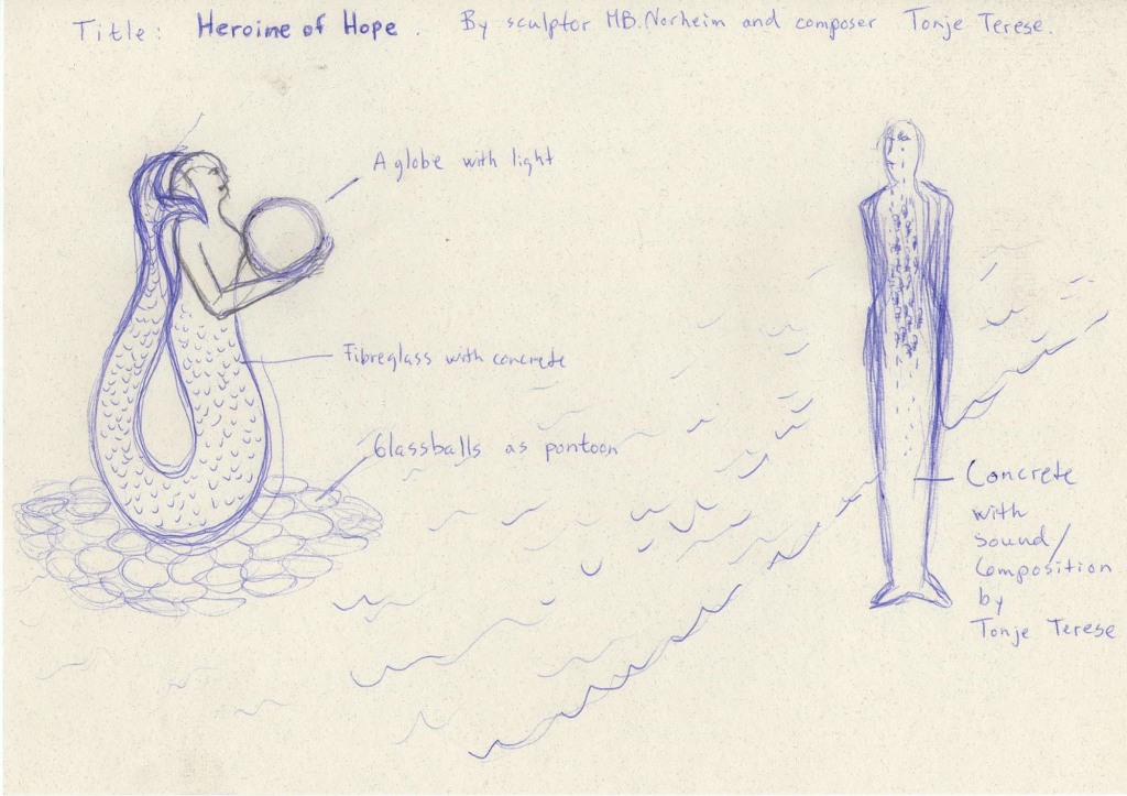 Værkerne tager autobiografisk udgangspunkt i Tereses sygdom, der i en periode gjorde det umuligt for hende at komponere og fik hende til at føle sig som den havfrue, der havde solgt sin stemme og blev fordømt til at leve en tavs og afskåret tilværelse under vandet. To betonskulpturer, en havfrue, der flyder på vandet og en grædende kvindefigur på land, kalder igennem et lydværk imod hinanden og fortæller en følelsesladet historie om de tavse stemmer i vores samfund og håbet om en bedre, mere rummelig verden under havoverfladen." Uddrag fra Kunstkritikk.dk , af Louise Steiwer "Vi har skapt to skulpturer som forholder seg til hverandre, på land og på vannet, Figuren på land ’Gråter skjeletter’, gråter for verden, mens han ser lengselsfullt ut på ’Håpets Heltinne’ i sjøen. Hun er en havfrue, som bærer en lysende klode, mens hun flyter på glasskuler. Halen hennes krøller seg som et evighets symbol. Lydbildene, skapt for hver av dem, gir dem stemmer." Marit Benthe Norheim OM UDSTILLINGEN: