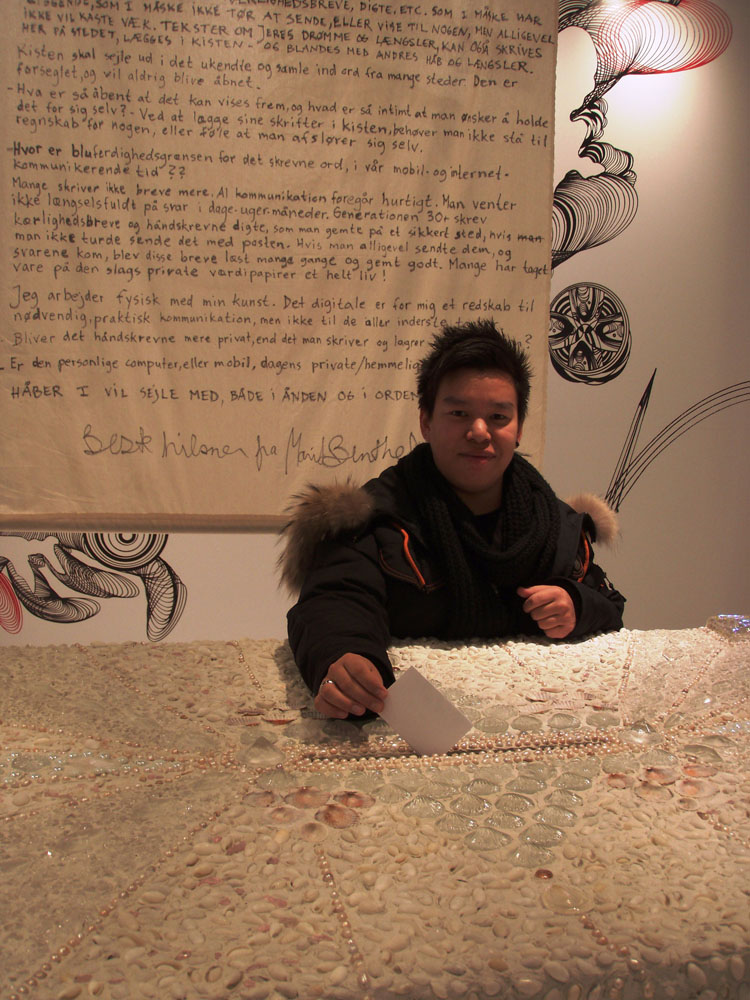 Publikumsinddragende kunstevent til projekt ”Life-Boats” - en sejlende skulpturel installation i beton af billedkunstner Marit Benthe Norheim. Skattekisten, med brevåbning, dekoreret med krystaller og ægte perler, skal placeres inde i kvindeskulpturen; ”Mit skib er ladet med længsel”. I kisten kan man lægge kærlighedsbreve, digte etc. som man har liggende - som man måske ikke tør at sende eller vise til nogen, men alligevel ikke vil destruere. Tekster om drømme og længsler kan også skrives på stedet, lægges i kisten og blandes med andres håb og længsler. Kisten skal sejle ud i det ukendte, den er forseglet og vil aldrig blive åbnet. Idéen er at involvere et bredt publikum igennem hele Europa, med opstart hos Friis. Denne kiste er det første ”spadestik” - den første del af projekt ”Lifeboats” i fuld målestok. I løbet af Port 2010 udstillingsperiode, bliver besøgende opfordret til at skrive. - Emnet kan være: ”Hvad er så åbent at det kan vises frem og hvad er så intimt at man ønsker at holde det for sig selv?” - Ved at lægge sine skrifter i kisten, behøver man ikke stå til rette for nogen, eller afsløre sig selv.