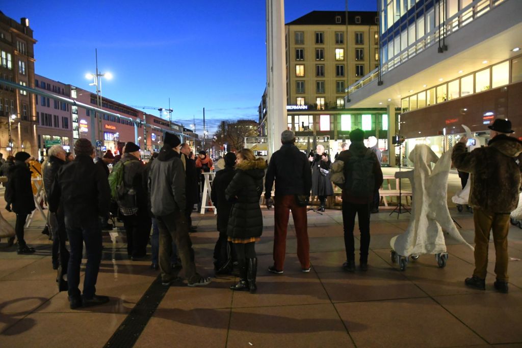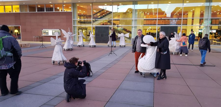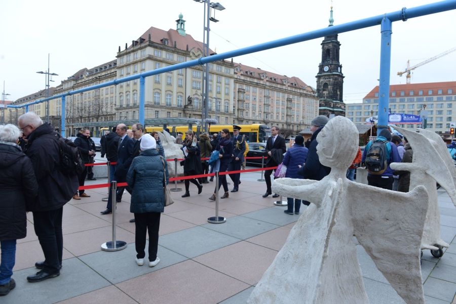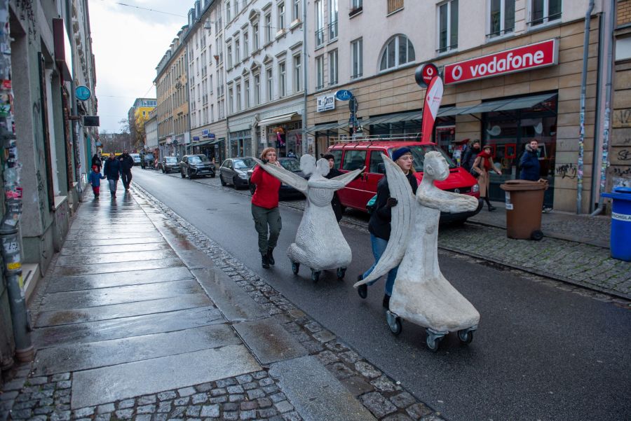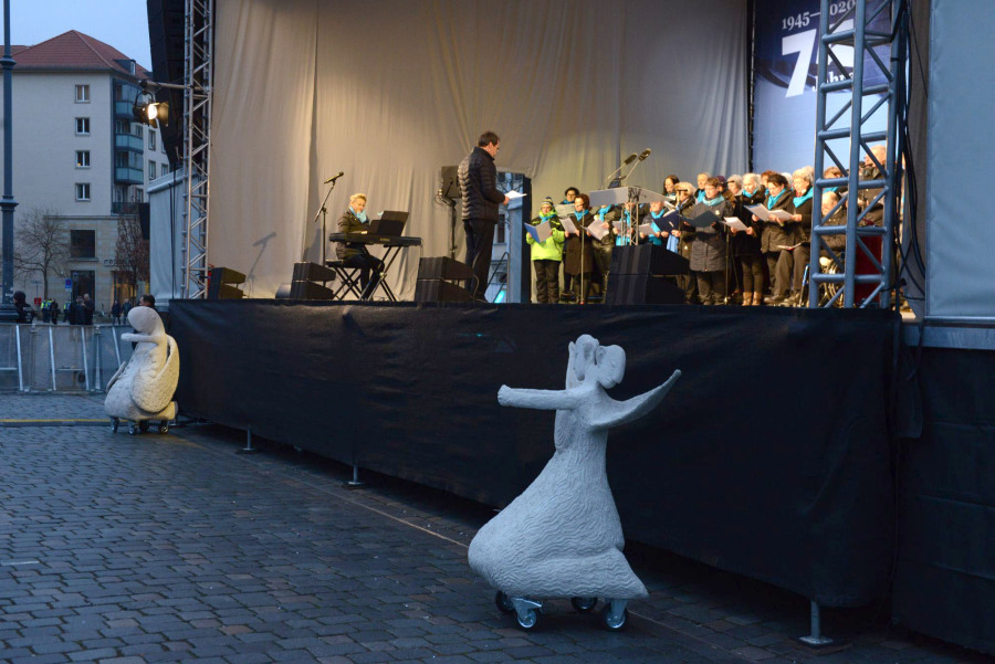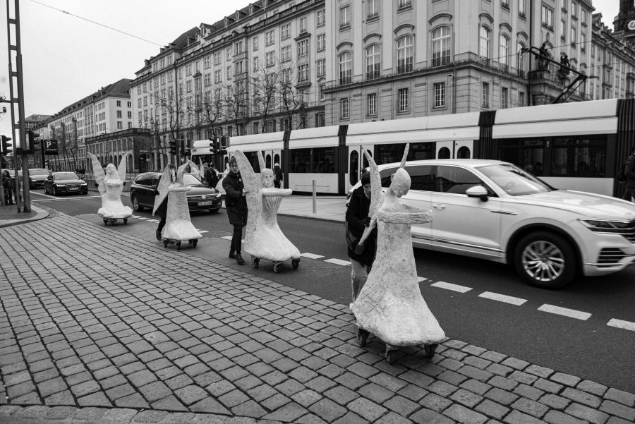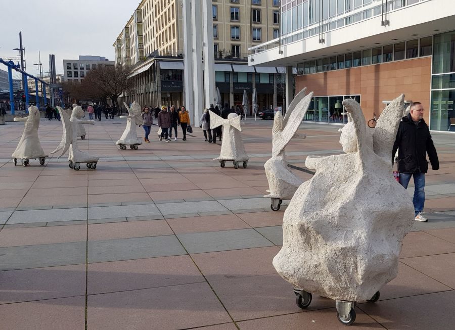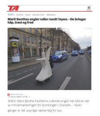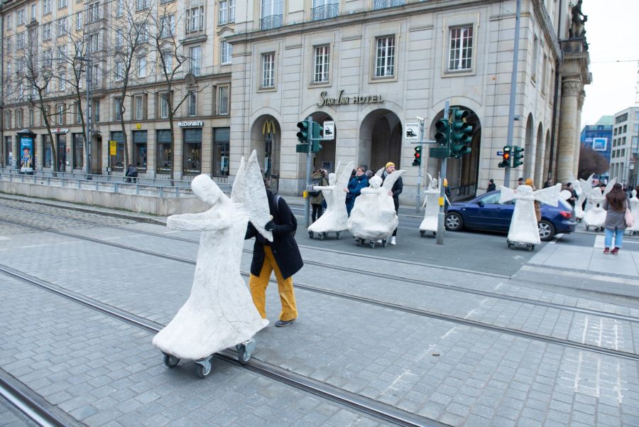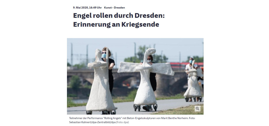 Rullende Engle til Dresden I anledning af 75-års dagen for bombardementet af Dresden den 13. februar 1945 Fra den 5. Februar frem til den 16. Februar 2020 Kunstprojektet er et initiativ fra Kunsthaus Dresden med den dansk-norske kunstner Marit Benthe Norheim og den norske komponist Geir Johnson i byrummet i centrum af Dresden. Engleflokken vil ankomme til centrum foran Culture Palace den 5. februar kl. 17.00. Hvor Borgmesteren af Dresden, Dirk Hilbert vil være tilstede.Derefter vil de bevæge sig rundt i Dresden frem til Mindemarkeringen den 13. februar, sat i programmet som en Performance af 17 engle, hvor bl.a Forbundspræsidenten Frank-Walter Steinmeier vil være tilstede.En dag hvor tusinde af mennesker vil holde hinanden i hænderne i en ring rundt om byen, for at vise at de står samlet for fred.Derefter vil hele engleflokken fortsætte sin færd i Dresden, frem til den 8. maj, dagen for kapitulationen.De ønsker å bruke dem som budbringere av håp, trøst og fred