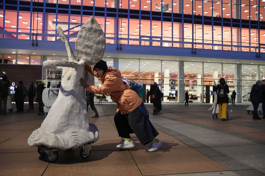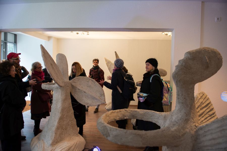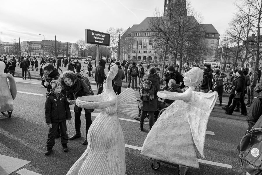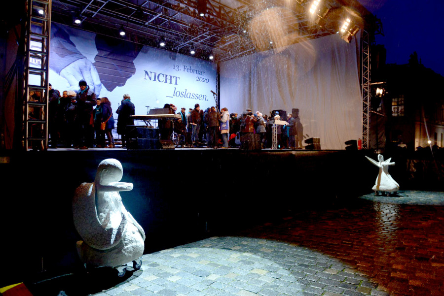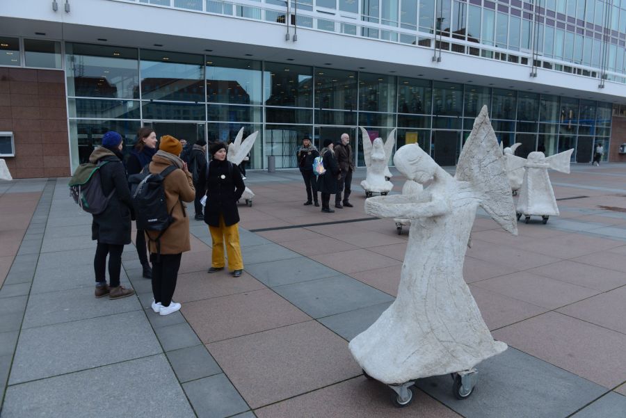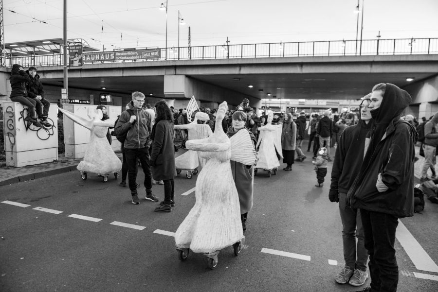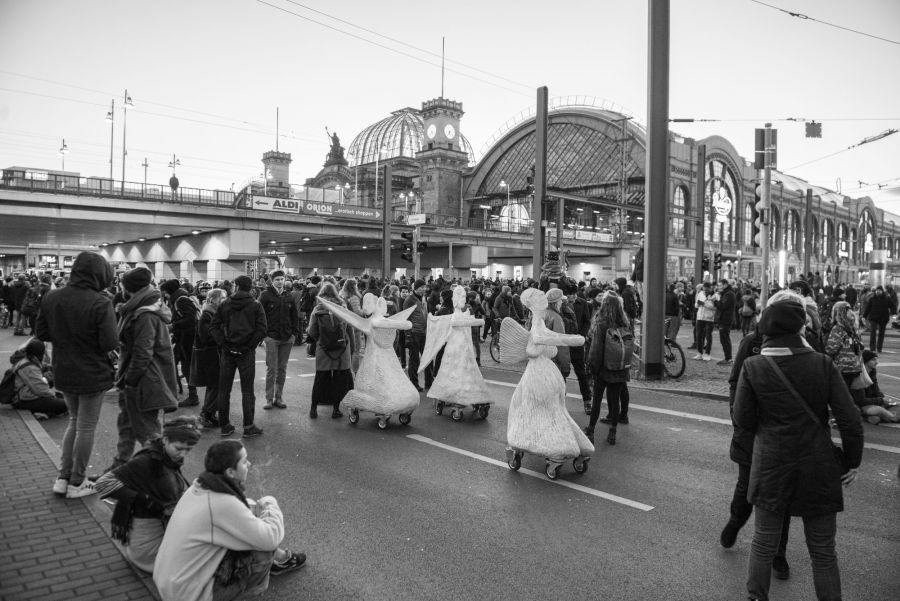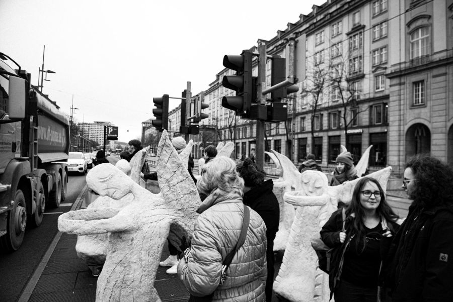 Rullende Engle til Dresden I anledning af 75-års dagen for bombardementet af Dresden den 13. februar 1945 Fra den 5. Februar frem til den 16. Februar 2020 Kunstprojektet er et initiativ fra Kunsthaus Dresden med den dansk-norske kunstner Marit Benthe Norheim og den norske komponist Geir Johnson i byrummet i centrum af Dresden. Engleflokken vil ankomme til centrum foran Culture Palace den 5. februar kl. 17.00. Hvor Borgmesteren af Dresden, Dirk Hilbert vil være tilstede.Derefter vil de bevæge sig rundt i Dresden frem til Mindemarkeringen den 13. februar, sat i programmet som en Performance af 17 engle, hvor bl.a Forbundspræsidenten Frank-Walter Steinmeier vil være tilstede.En dag hvor tusinde af mennesker vil holde hinanden i hænderne i en ring rundt om byen, for at vise at de står samlet for fred.Derefter vil hele engleflokken fortsætte sin færd i Dresden, frem til den 8. maj, dagen for kapitulationen.De ønsker å bruke dem som budbringere av håp, trøst og fred