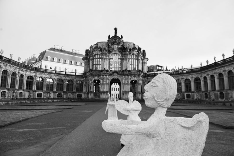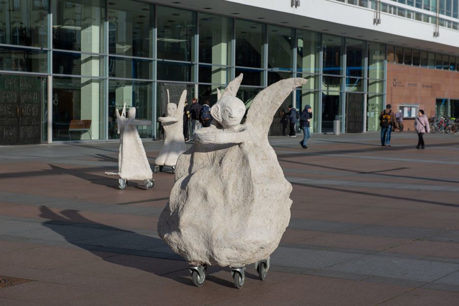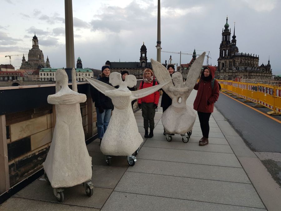 The performance with 17 rolling angel sculptures made of white concrete by the Norwegian-Danish artist Marit Benthe Norheim with music by composer Geir Johnson will be presented under the title ROLLING ANGELS. Mit sicherem Abstand simultaneously on both banks of the Elbe at the three historical bridges, Augustusbrücke, Albertbrücke and Blaues Wunder.  All bridges in Dresden, except for Blaues Wunder, were destroyed by German troops shortly before the end of the war and rebuilt after the war. Today, the bridges can also be regarded as symbols of the connectedness of the urban community.