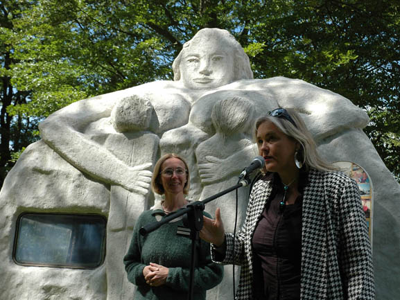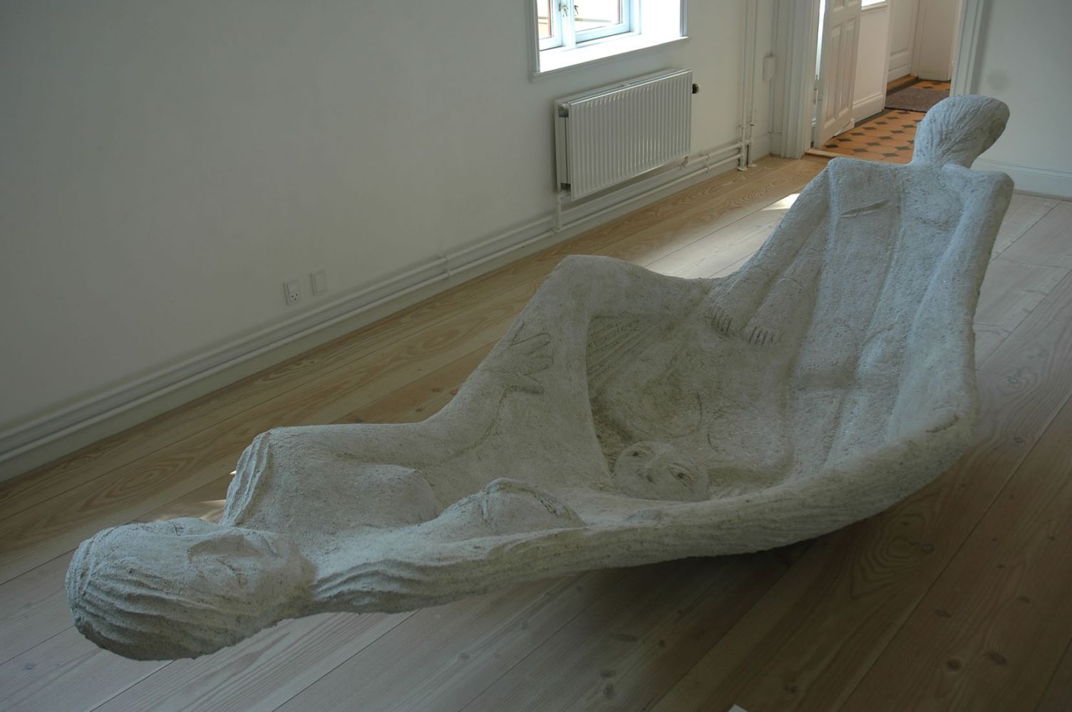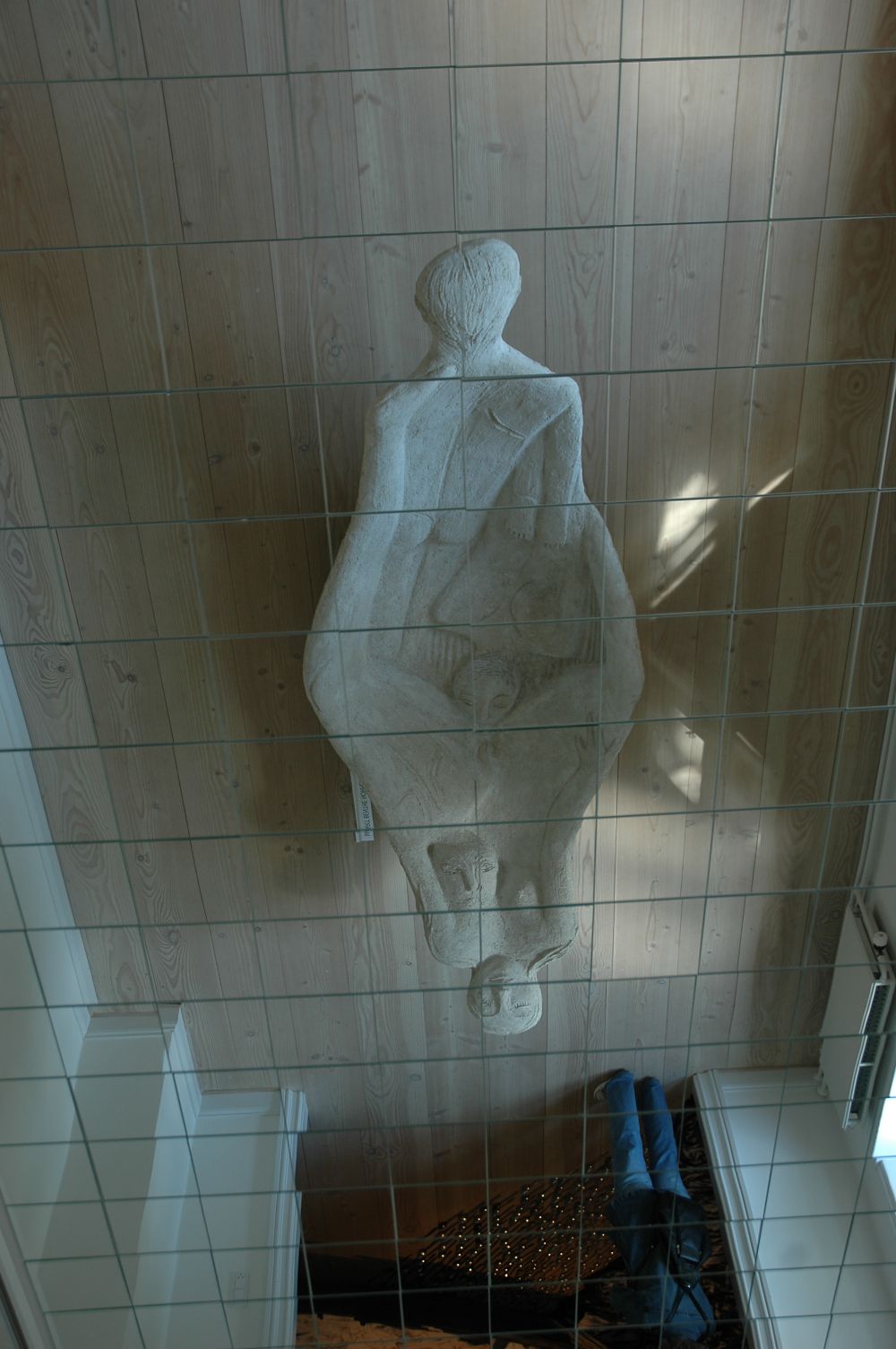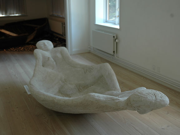 ”Kvindebåd” er lavet i betong:- En kvinde som åbner sit skød, med mænd som bliver født eller forsøger at trænge sig ind. Hun nyder, yder eller bliver brugt/misbrugt.-Hun er både tryg og farlig. Kvinden udgør en båd med sine ”passagerer”. Tolkningen er meget åben. Men kan f.eks. henvise til kvinder som kommer hertil med drømmen om et nyt liv og af forskellige årsager ender i prostitution. Med lyden af den arabiske recitering fra det næste rum, kan man også komme til at få associationer til debatten om kvinders position i mange muslimske lande. Men også til de mange misbrug som sker i vor egen verden – på mange planer. Samtidigt med at den stærke moderkvinde og kvindekraften skræmmer og udgør en trussel på forskellig vis i forskellige kulturer. I loftet over skulpturen hænger et spejl.